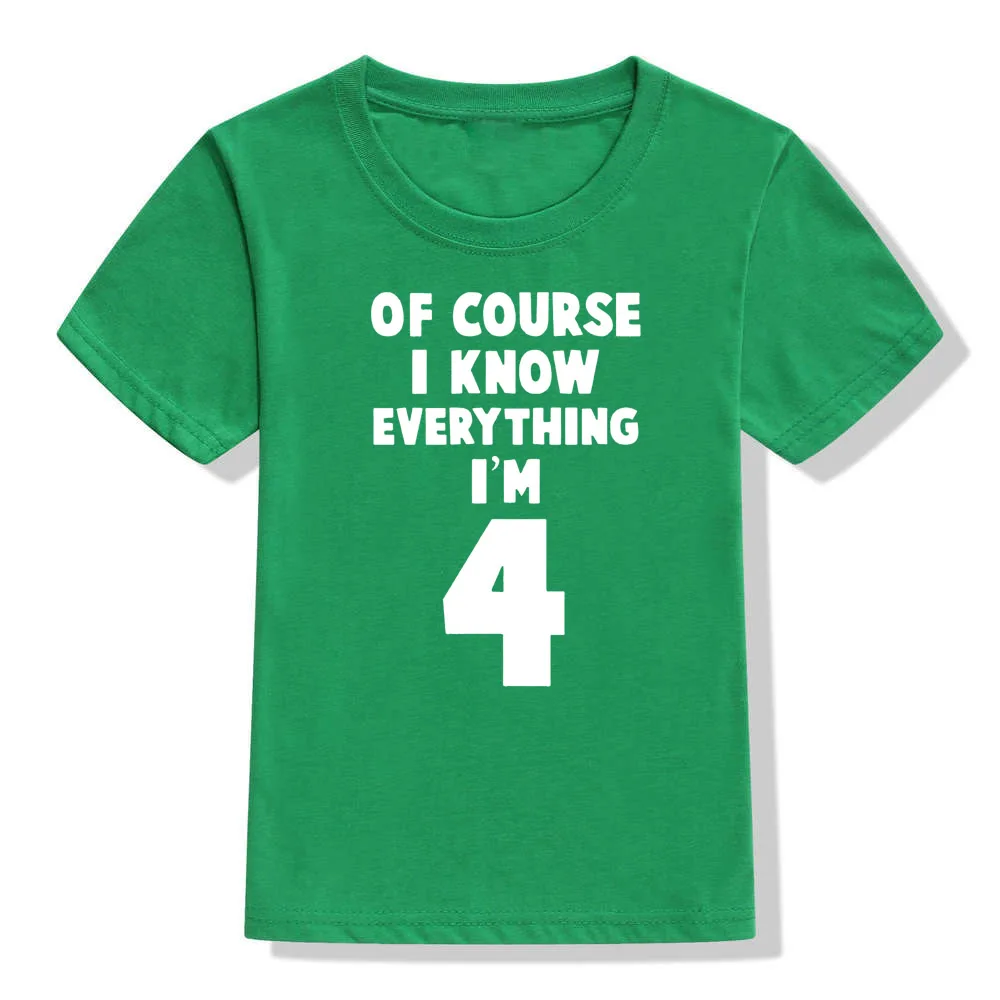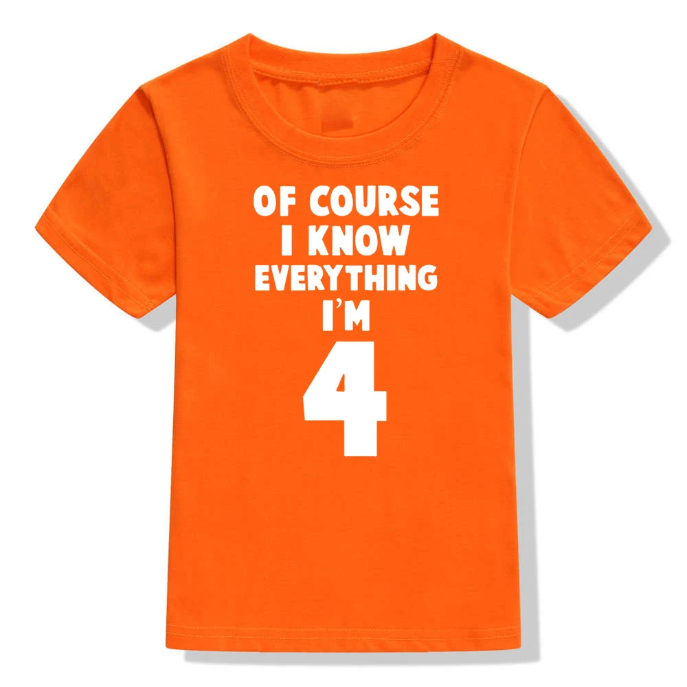 Конечно, я знаю все, что я 4, Детская футболка на день рождения футболка с короткими рукавами для маленьких мальчиков и девочек детские модные повседневные футболки