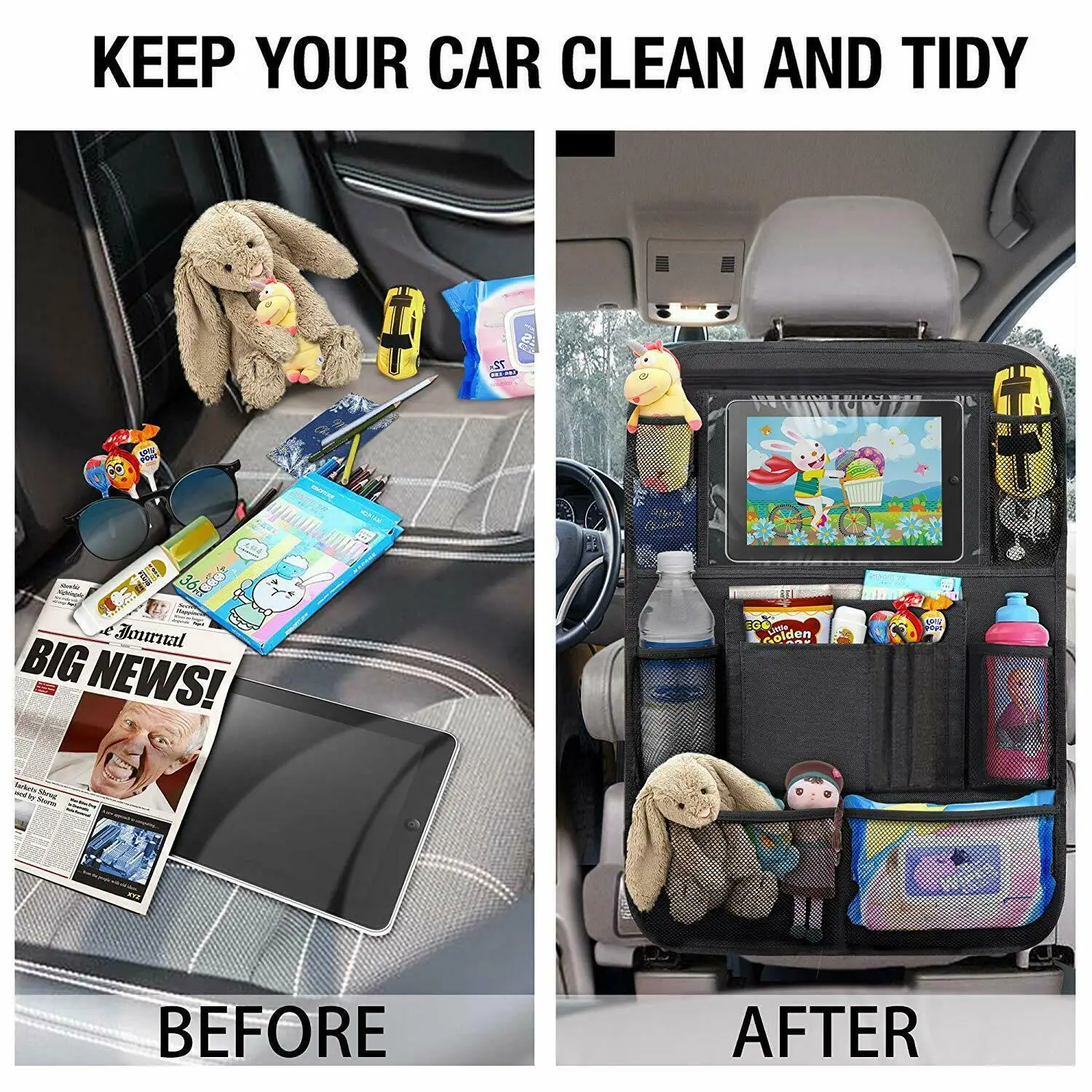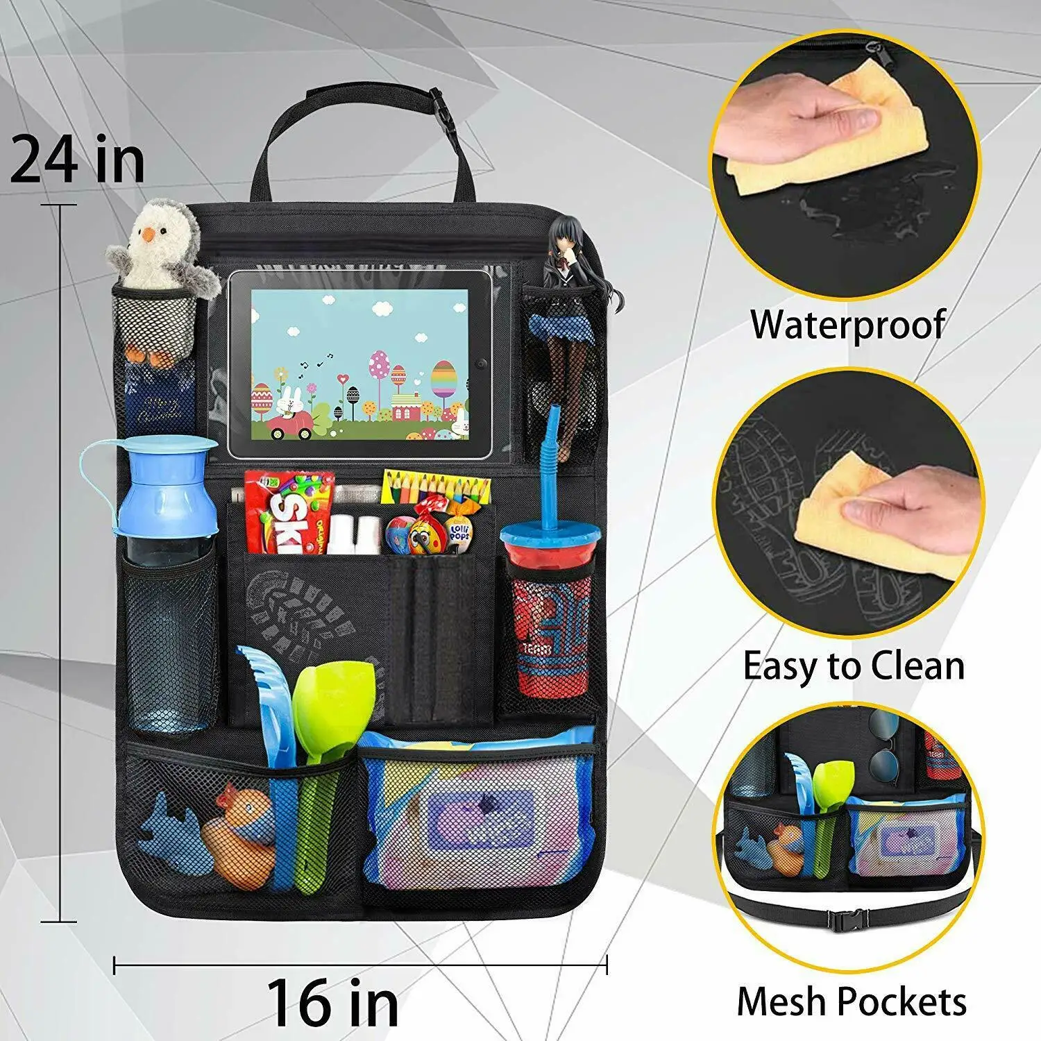 [Водонепроницаемый и легко чистится]: с помощью нашего водонепроницаемого органайзера для спинки сиденья вам понадобится только влажная ткань для очистки грязных отпечатков на матрасах, машинная стирка ткани для более легкого ухода. Быстро и удобно.