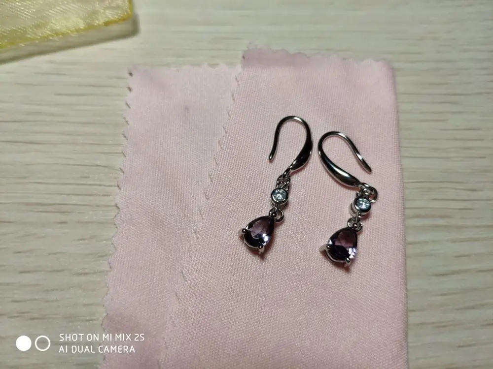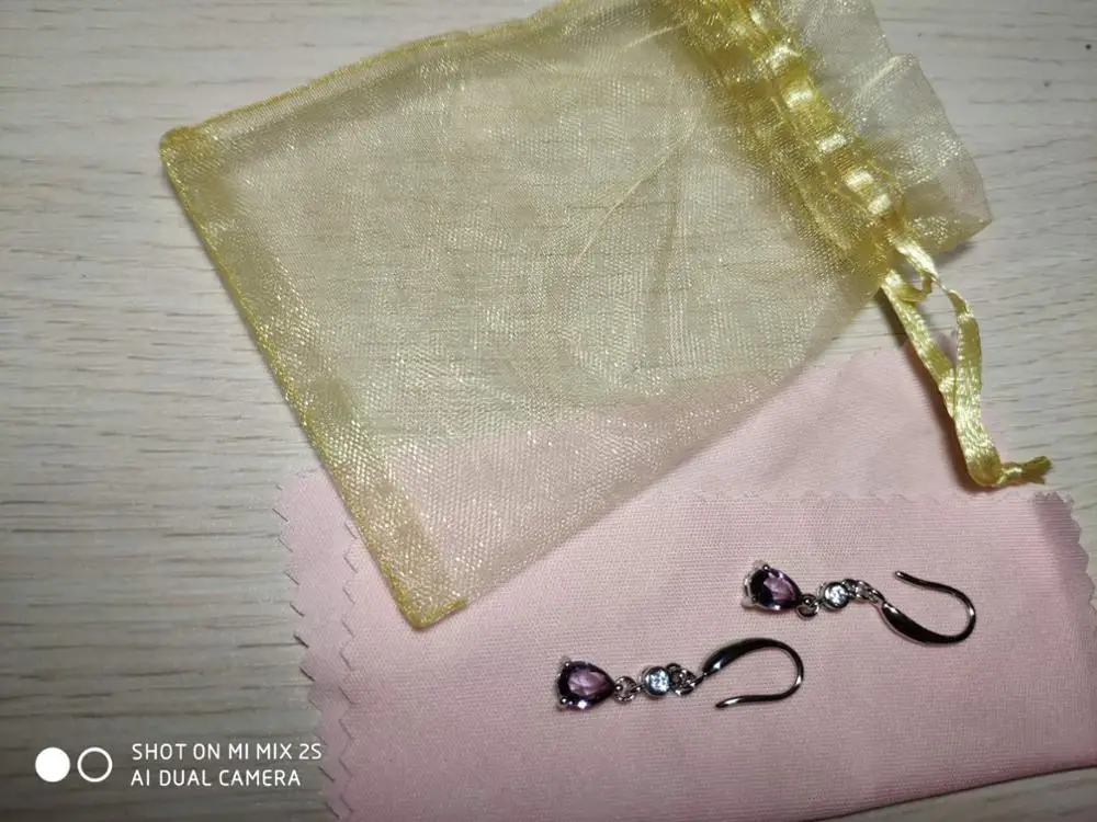 Точно как на фото.Приятные, нежные сережки, "камушки" мелкие. Были в пути 5 недель.Упакованы в китайский газовый мешочек, дошли целыми и невредимыми.Спасибо.