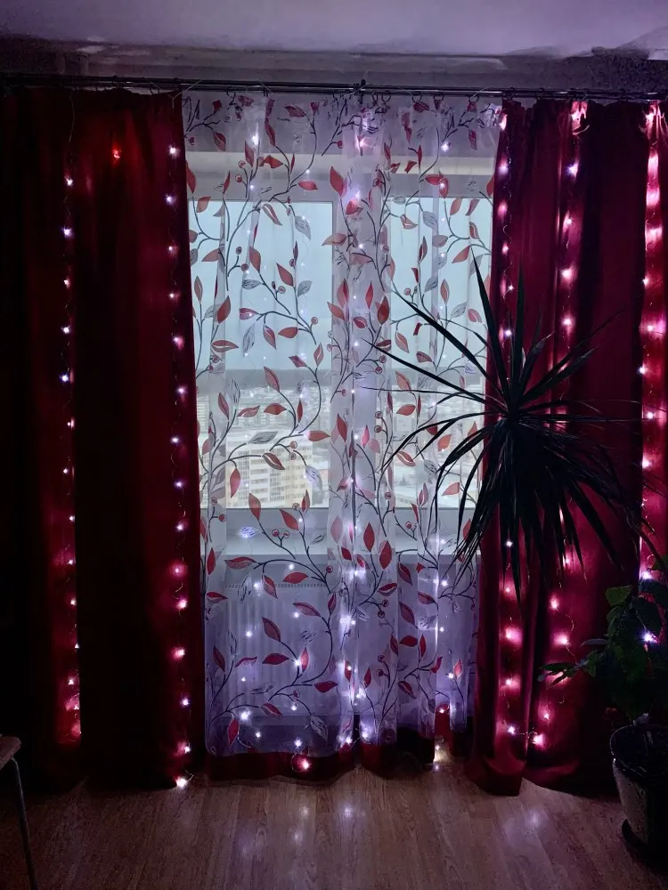 Это ооочень красиво Я заказывала по размеру 3х3, отлично подошла на окно с балконной дверью. 8 режимов подсветки, есть пульт, батареек в комплекте нет. Все диоды аккуратно скручены, ничего не запутано. Если не хотите, чтобы нити спускались до пола, можно не расправлять ниточки, тогда они будут спускаться в виде спиралек на ту длину, как вы захотите. Подключается через usb кабель, можно применить вилку от любого зарядного устройства