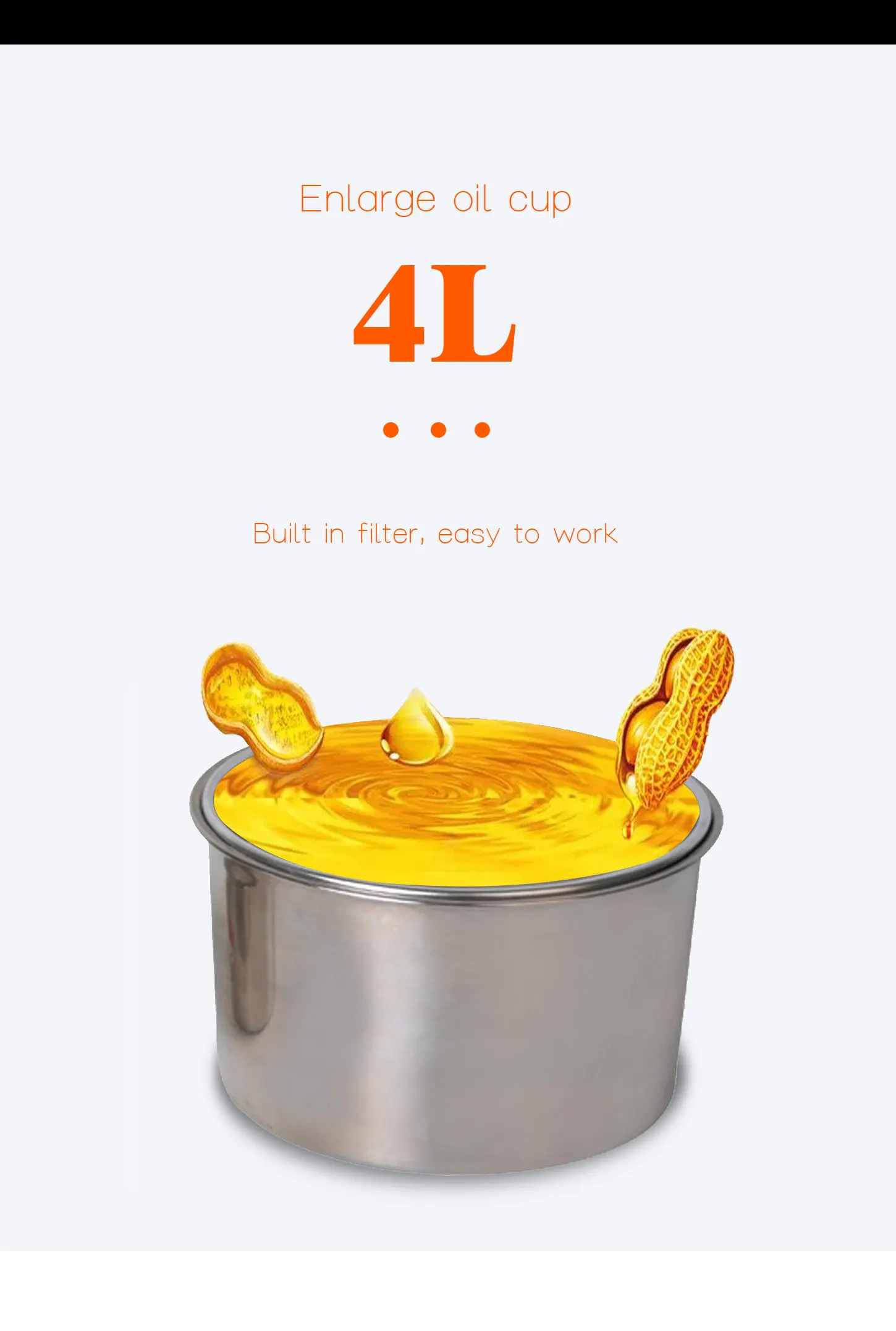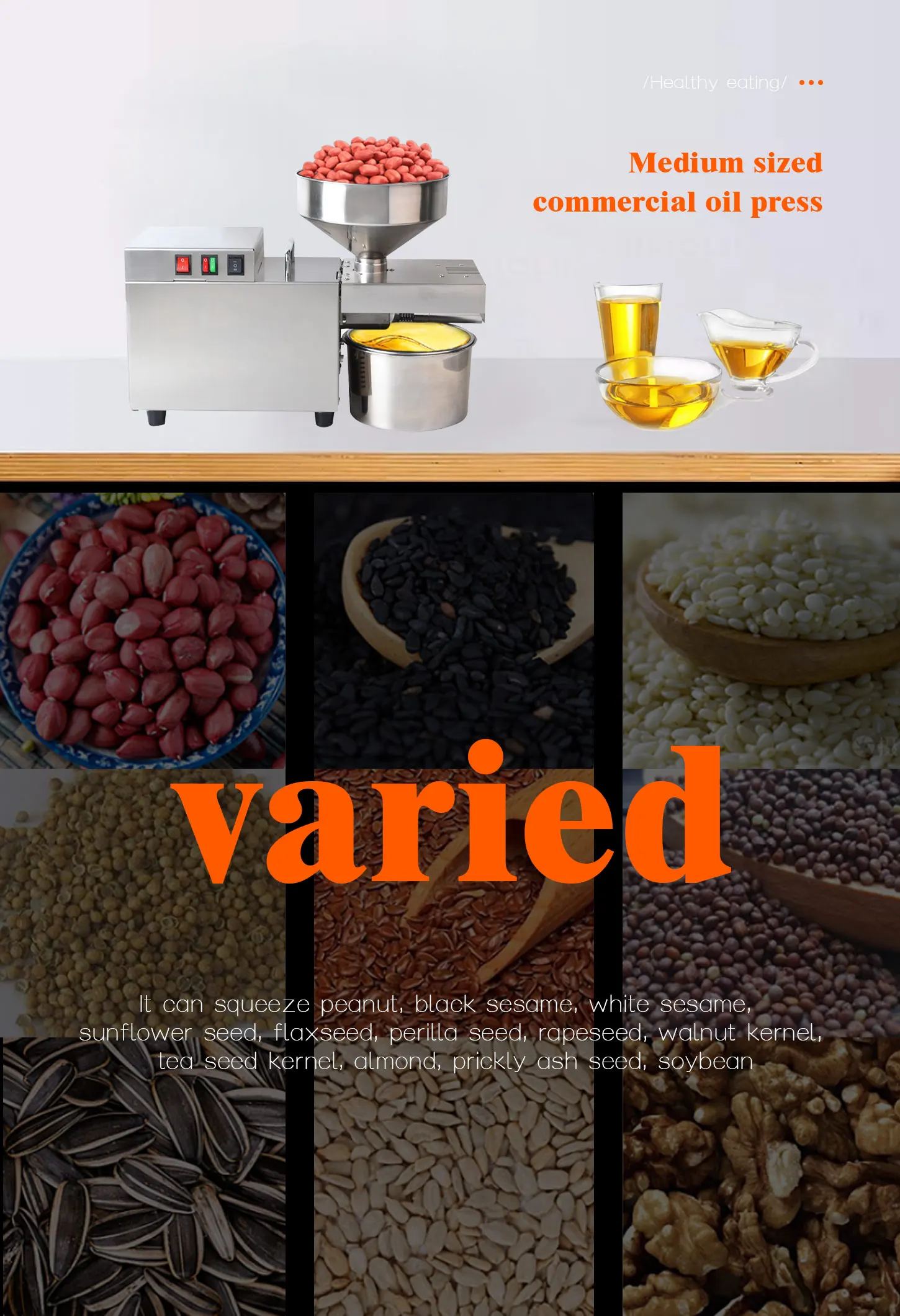 Поддержка дробления почти всех семян растений, включая арахисовое масло, подсолнечное масло, рапсовое масло, масло белого кунжута, масло черного кунжута, масло камелии, масло канолы, масло семена канолы, масло сои, масло фундука, оливковое масло, миндальное масло, льняное масло, масло Семена базилика, масло грецкого ореха, Масло кунжута, масло облепихи, масло семян тыквы, масло семечко сосны, масло семян кувшина и т. Д.