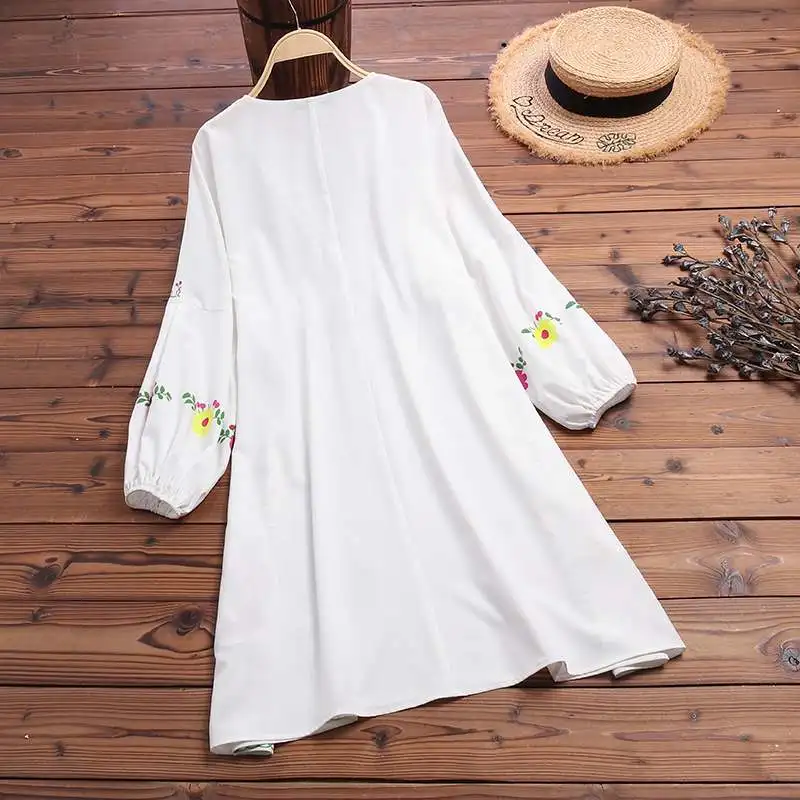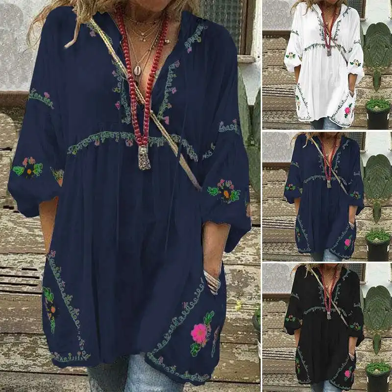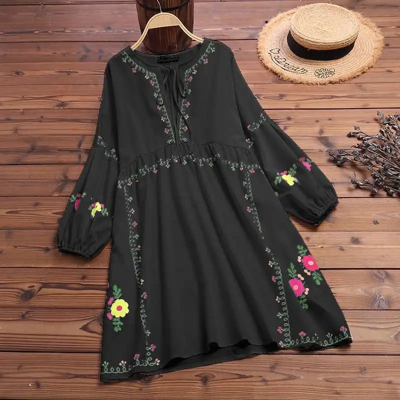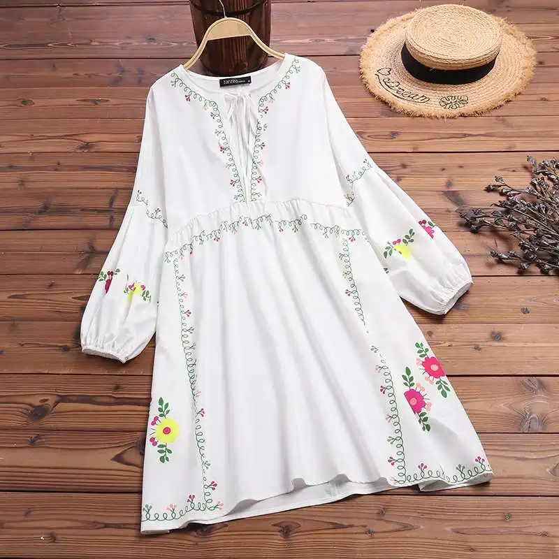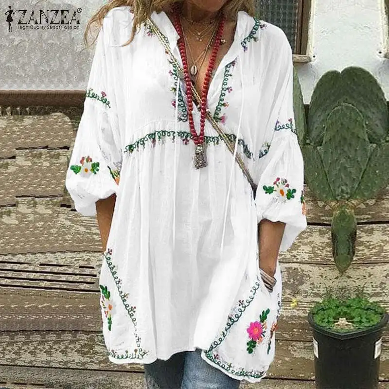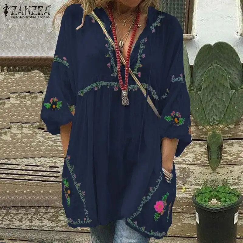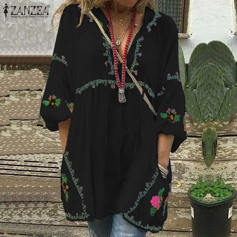 Женская блузка с принтом ZANZEA 2021, богемные летние платья, Повседневная рубашка с длинным рукавом с буфами, блузы, женский халат с V-образным вырезом, туника оверсайз