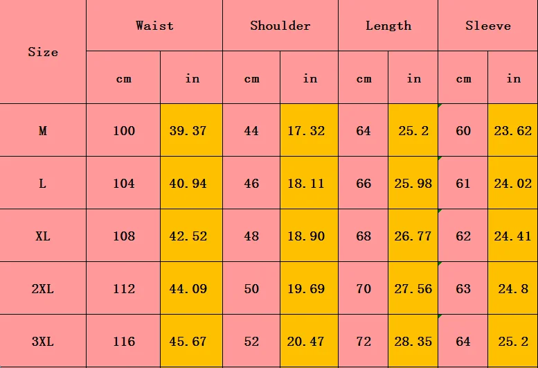Размер Сумка на плечо (см) Обхват талии (см) Длина (см) Длина рукава (см) М 44 100 61 60 L 46 104 66 61 XL 48 108 68 62 2XL 50 112 70 63 3XL 52 116 72 64 ГБ Качество является первым с лучшим обслуживанием. Все клиенты-наши друзья. Состояние: 100% новый и высокое качество