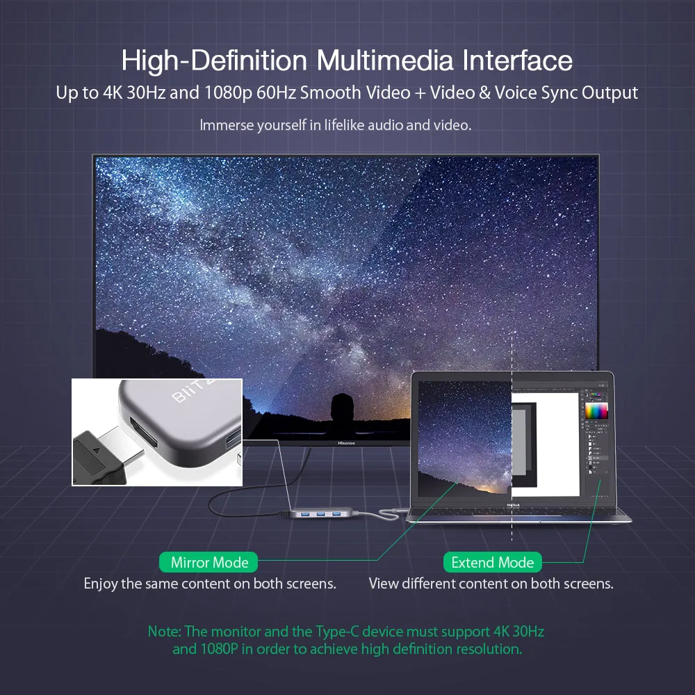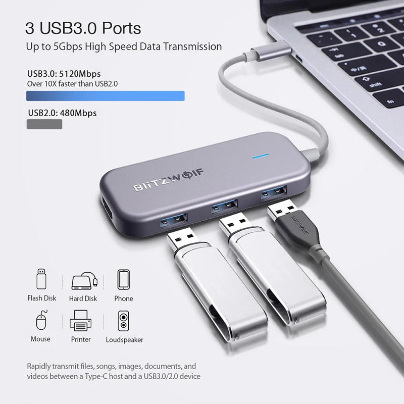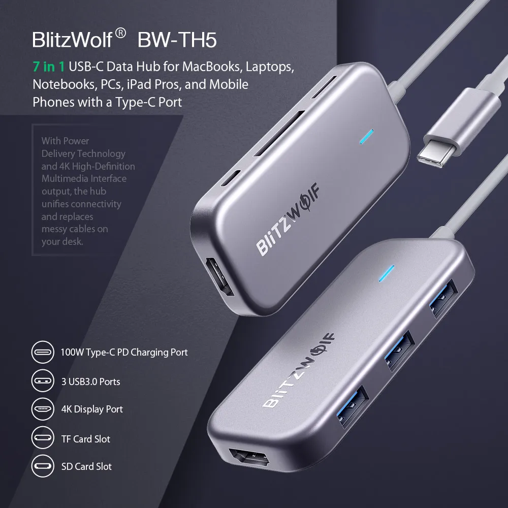 USB-концентратор BlitzWolf BW-TH5 7 в 1 с 3 портами USB 3,0, TF-кардридером, зарядкой PD, дисплеем 4K для MacBook, iPad