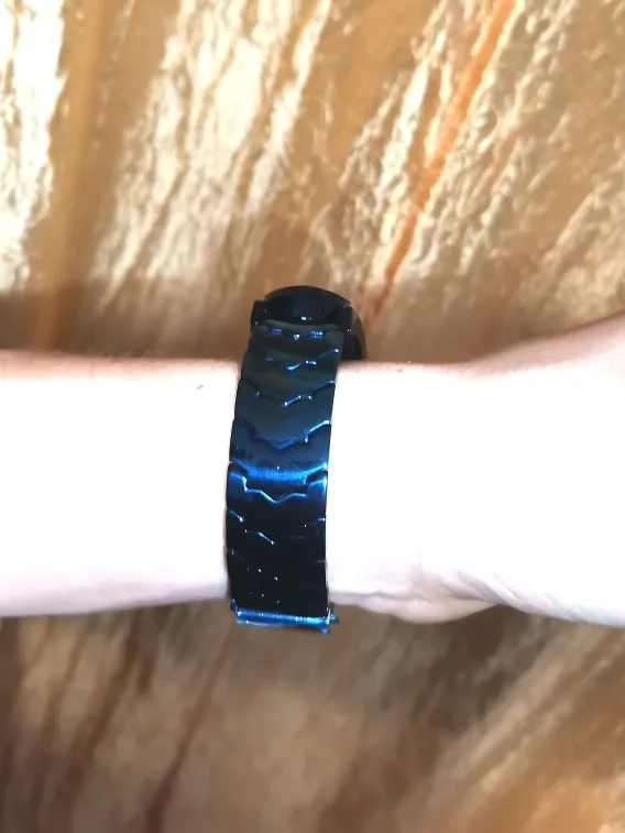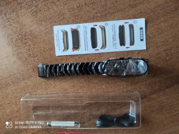 Завернули несколько посылок в одну поэтому ждал месяц до Смоленска. Браслет глянцевый, очень хорошего качества и приятный на ощупь. Весит в 3 раза больше, чем обычный браслет для MiBand 5, но меня это не беспокоит. Очень качественная коробка, в комплекте шли 4 резинки, 2 для 3 и 4 MiBand, и ещё два для пятого, и специальная выколотка для того, чтобы снять лишние звенья. Единственное что меня озадачило, так это снятие этих лишних звеньев, они достаточно крепко держаться, и это большой плюс. В общем могу сказать что браслет стоит своих денег и я рекомендую к покупке. Спасибо продавцу.