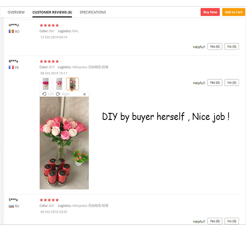 Хорошо упакованное вино и розы красивые, они выглядят очень естественно, единственная вина в том, что Основание зеленое и пластиковое, но лепестки такие же, как у настоящей свежей розы. Идеальный цвет, он сохраняет тепло и мягкость, как лепестки розы. Они также были с богатым запахом роз, хотя запах, который я думаю, был от спрея. Я не получил от вас палочки для еды, чтобы я мог положить самую длинную или короткую розу на орнамент