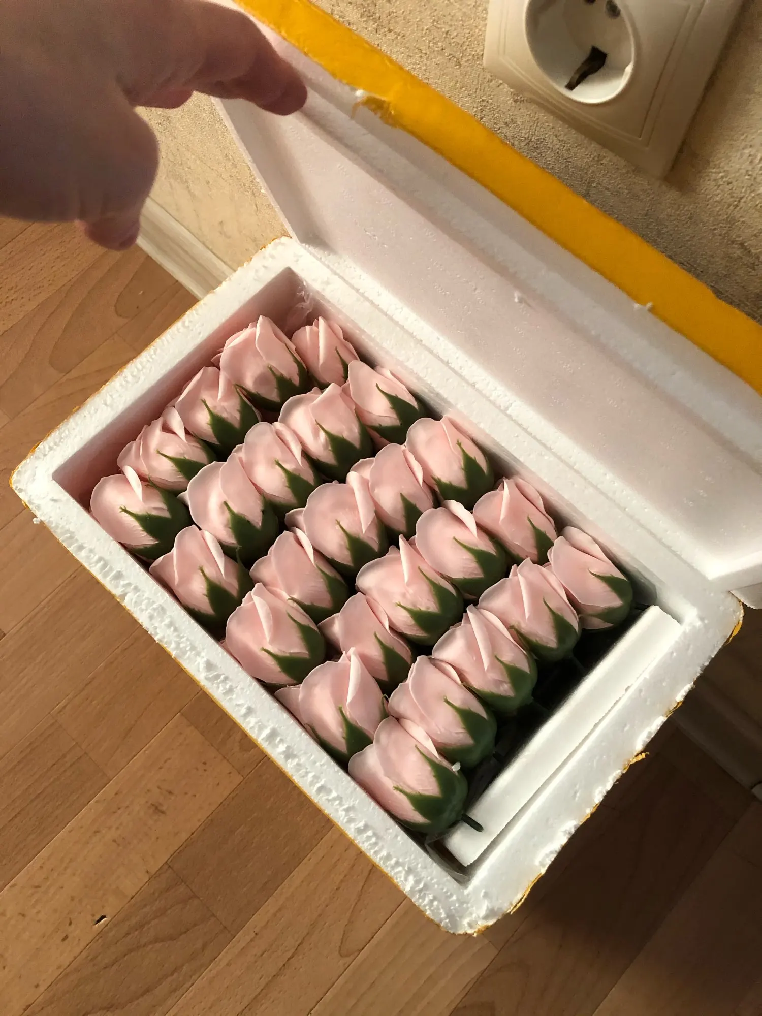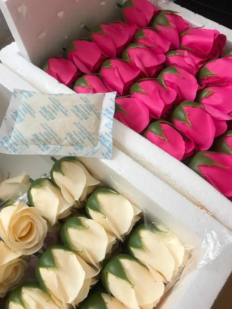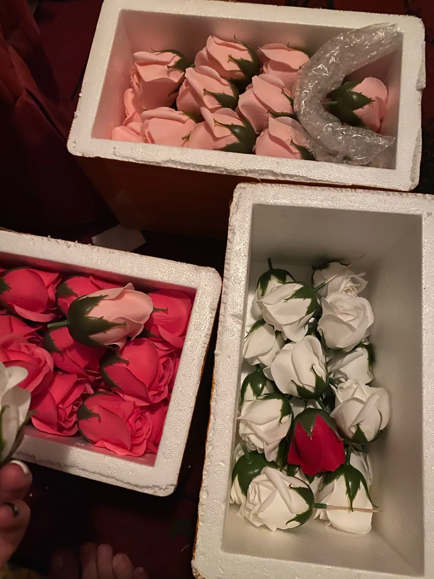 Сначала не увидела, что в коробке все 3 цвета, подумала лишь розовые пришли. А их очень компактно упаковали в пенопластовый «сундук». Я очень довольна заказом. Быстро пришли! кстати хочу сказать, про запах! Он невероятно вкусный! пахнет, как Таиланд :)