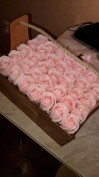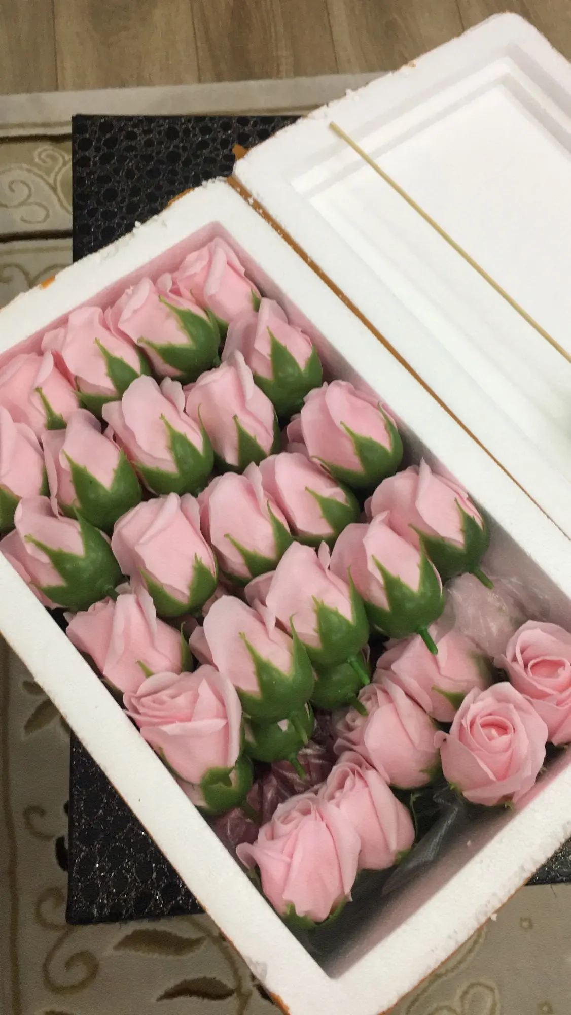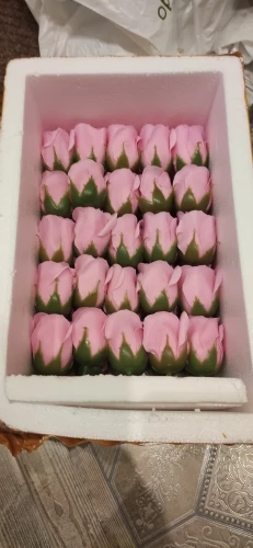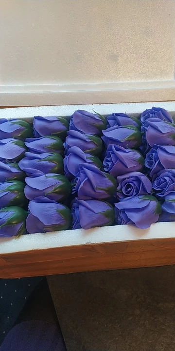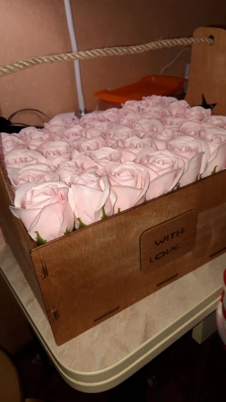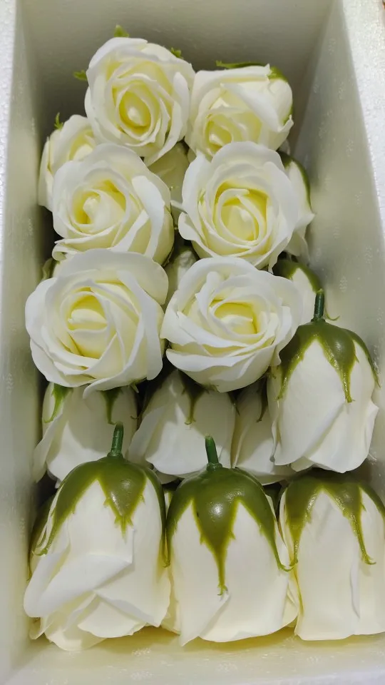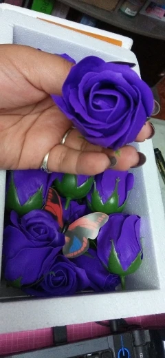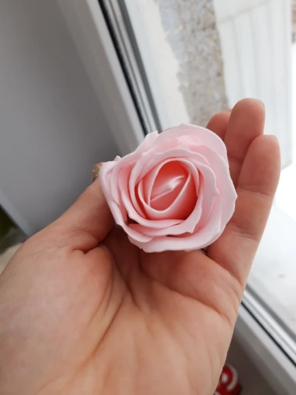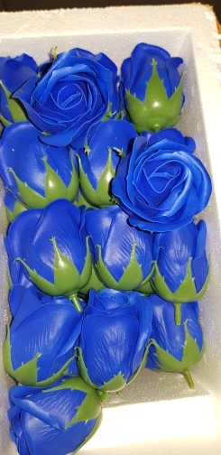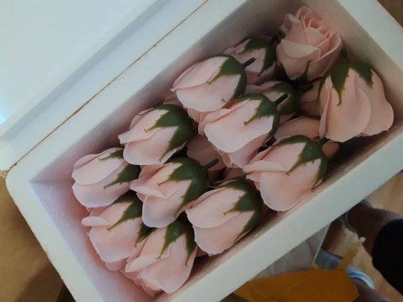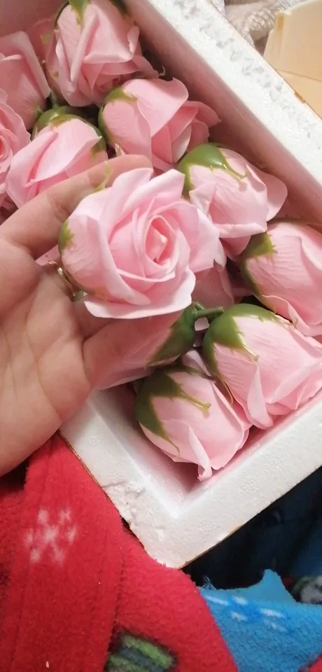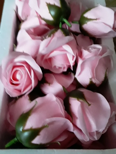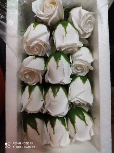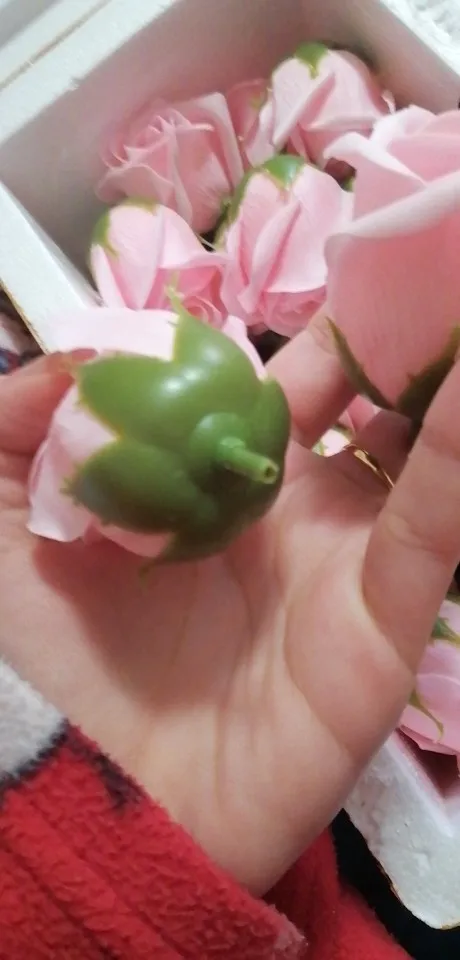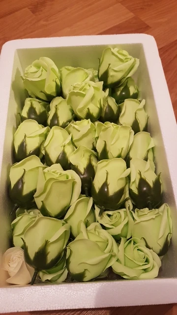 Продукт точно такой же, как описано, это мыло, оно делает пену и дает много, хотя это действительно более декоративно, чем что-либо еще. Запах роз-это химический запах, мягкий, но не очень приятный. Зеленая часть-это пластиковое основание, которое сохраняет структуру цветка. Хорошо упакованы и доставлены вовремя
