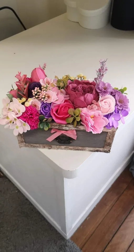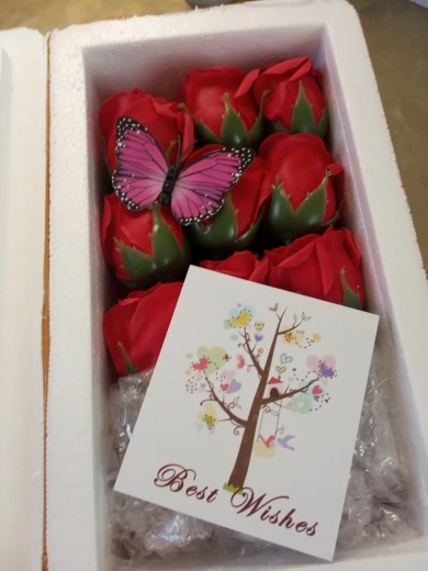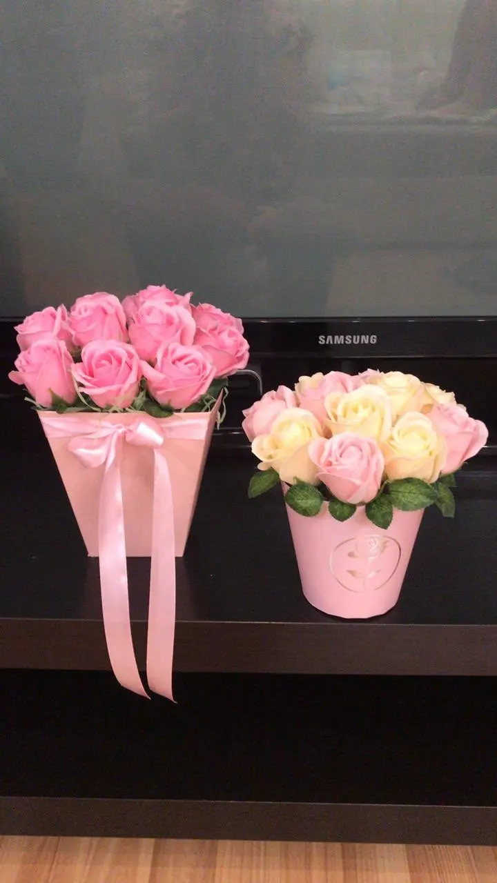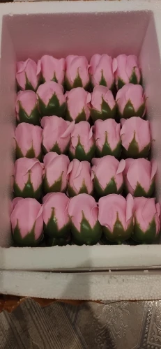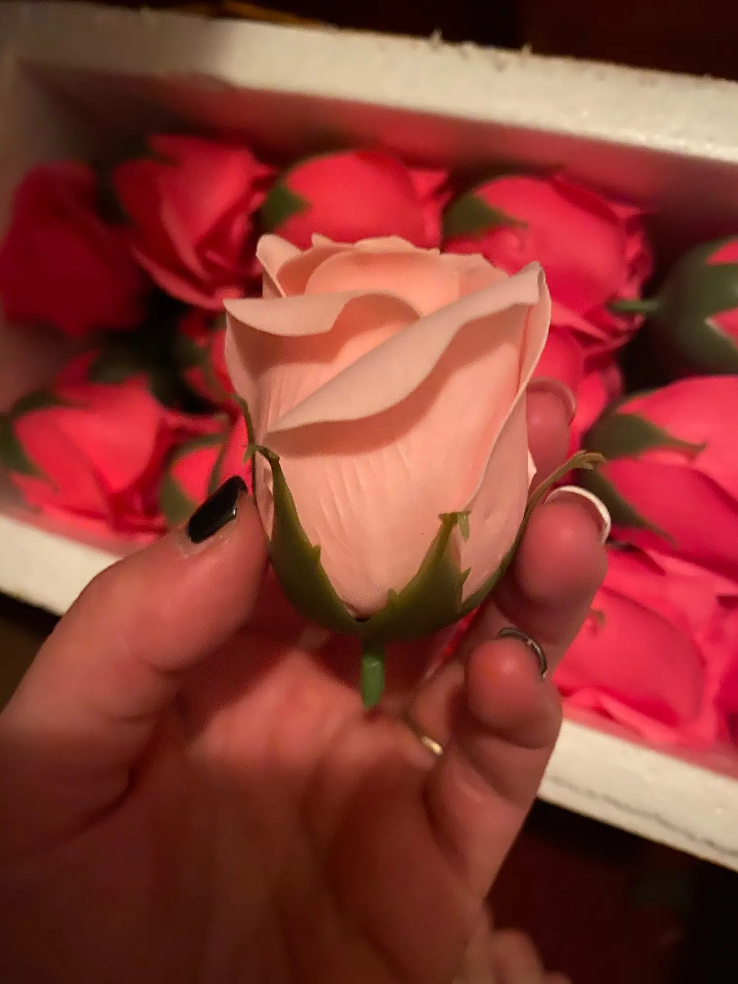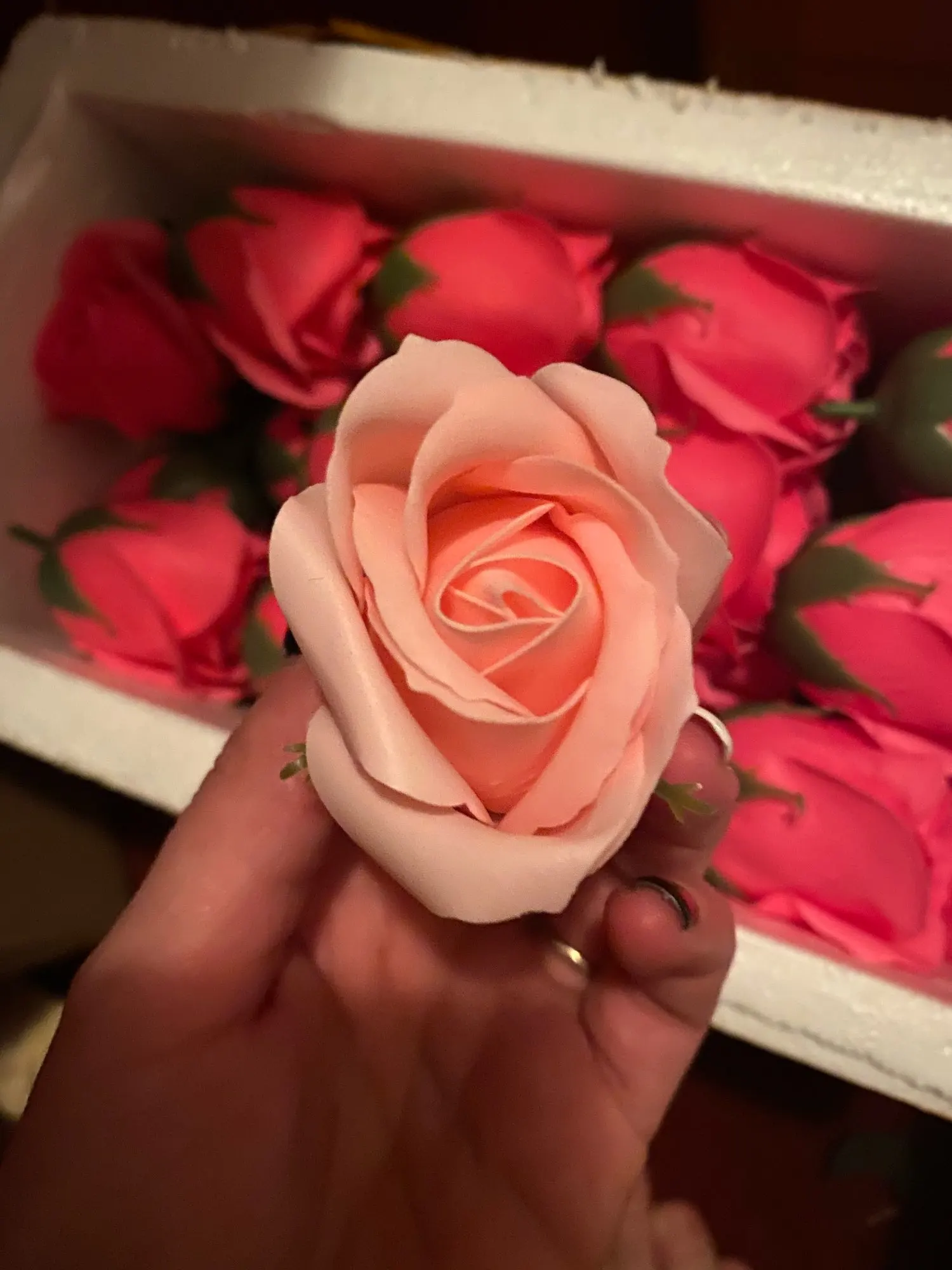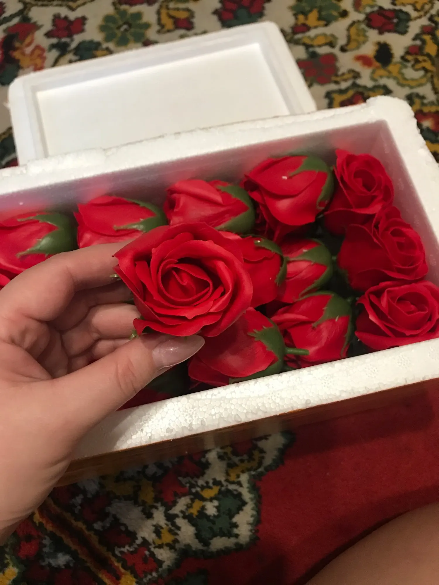 Продукт точно такой же, как описано, это мыло, оно делает пену и дает много, хотя это действительно более декоративно, чем что-либо еще. Запах роз-это химический запах, мягкий, но не очень приятный. Зеленая часть-это пластиковое основание, которое сохраняет структуру цветка. Хорошо упакованы и доставлены вовремя