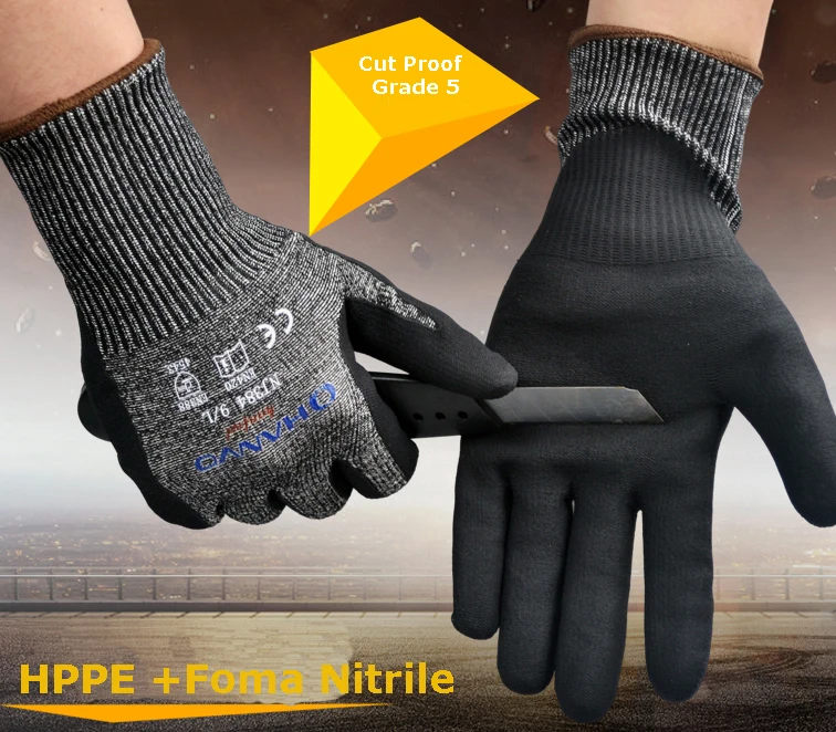 HPPE & стекловолокно & спандекс пряжа Бесшовная Трикотажная оболочка нитриловая ладонь окунутая, пенопластовая, CE EN388 защита от порезов 5 класса устойчивая Рабочая перчатка.(EN388 Cut 5 равен ANSI Cut level 4).
