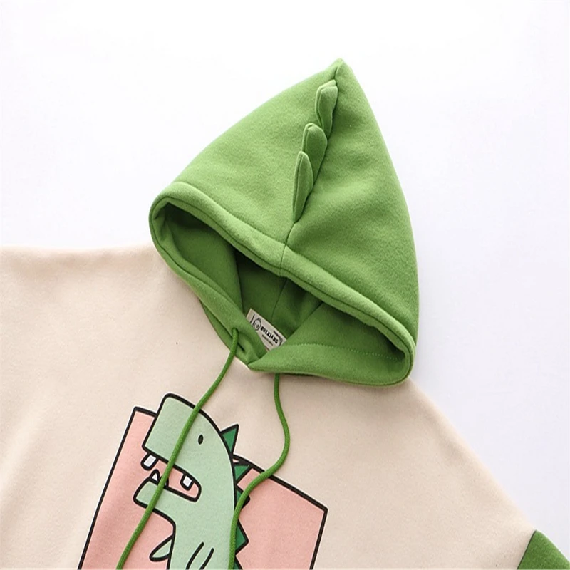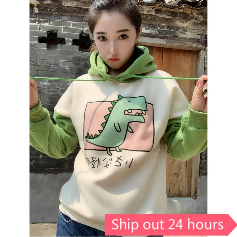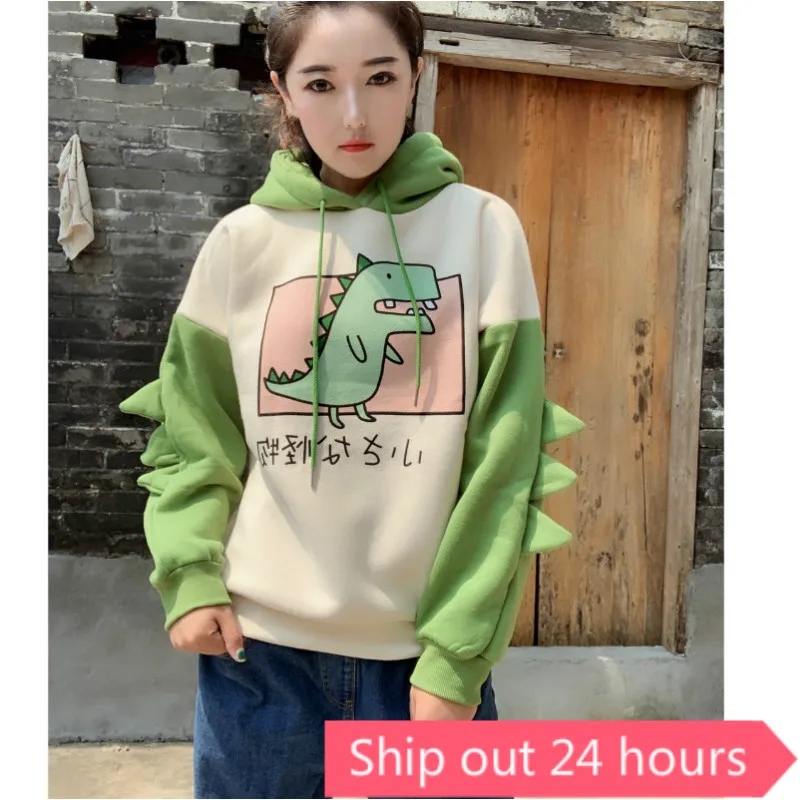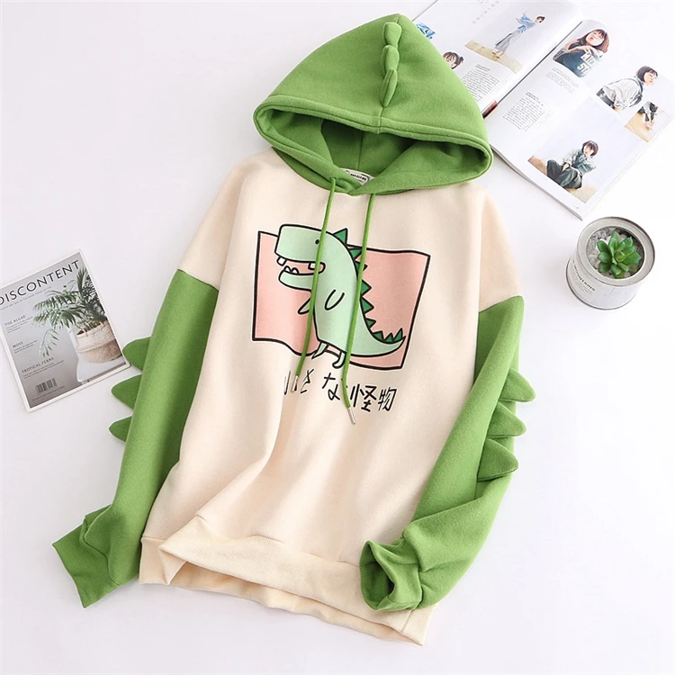 Веселая Женская толстовка с капюшоном, теплая флисовая толстовка, пуловеры с рогами, зеленая толстовка с капюшоном для девочек-подростков, толстовки с динозавром
