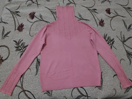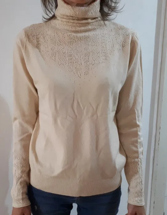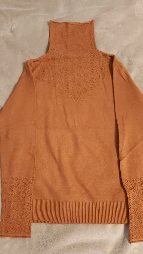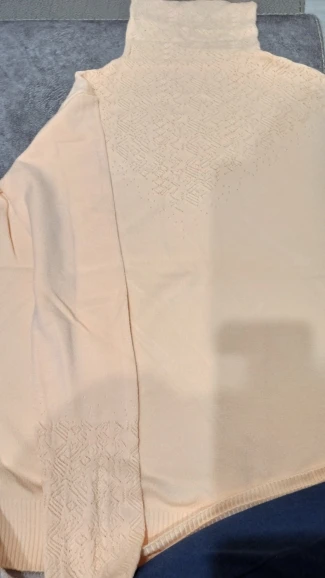 Потрясающий Красивый свитер. Цвет идеально. Рельефная горловина хомута и рукава действительно красивые. Падает немного меньше. Заказывайте на размер больше.