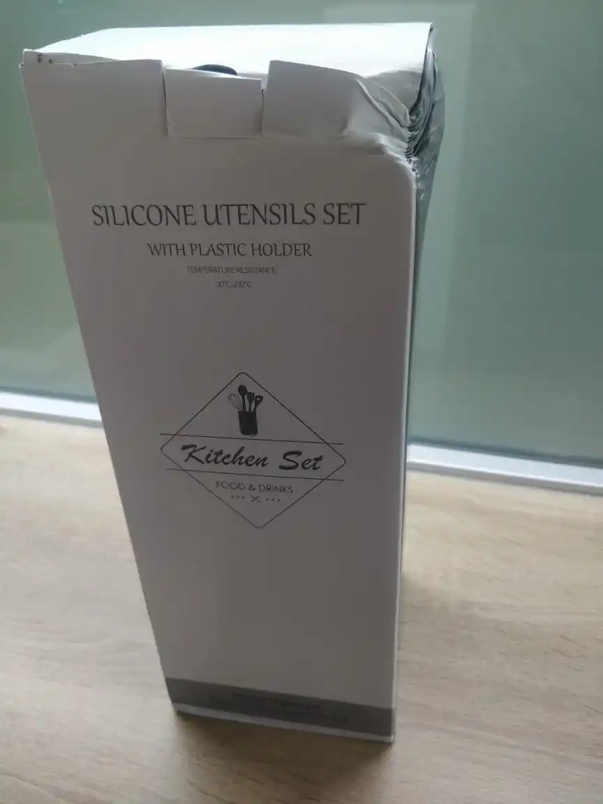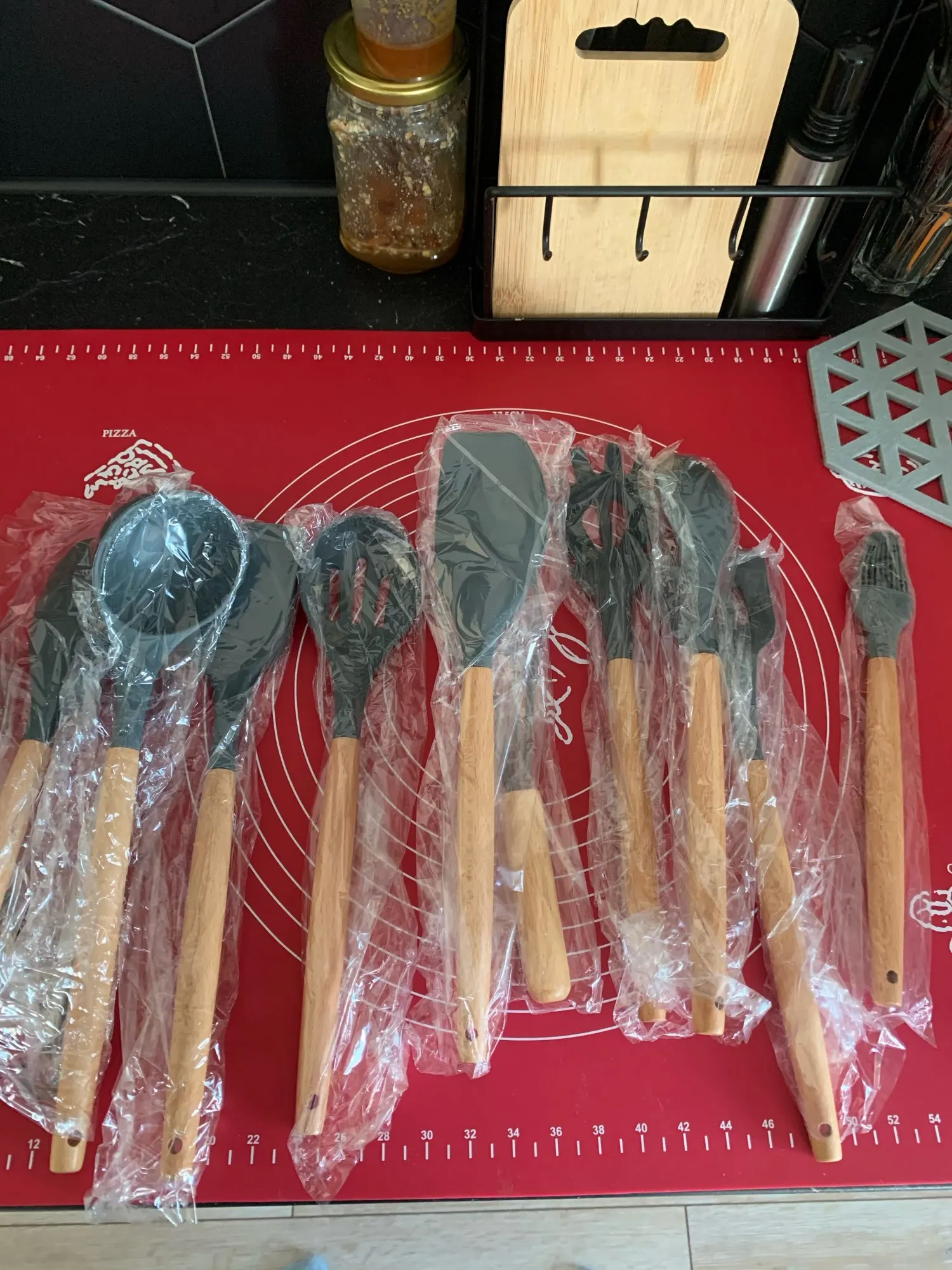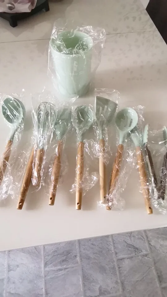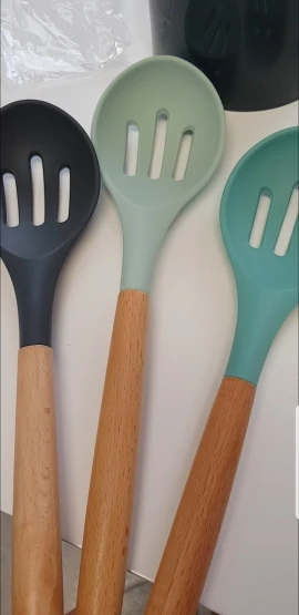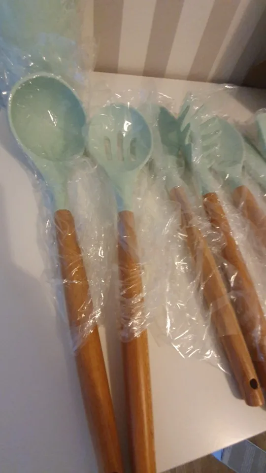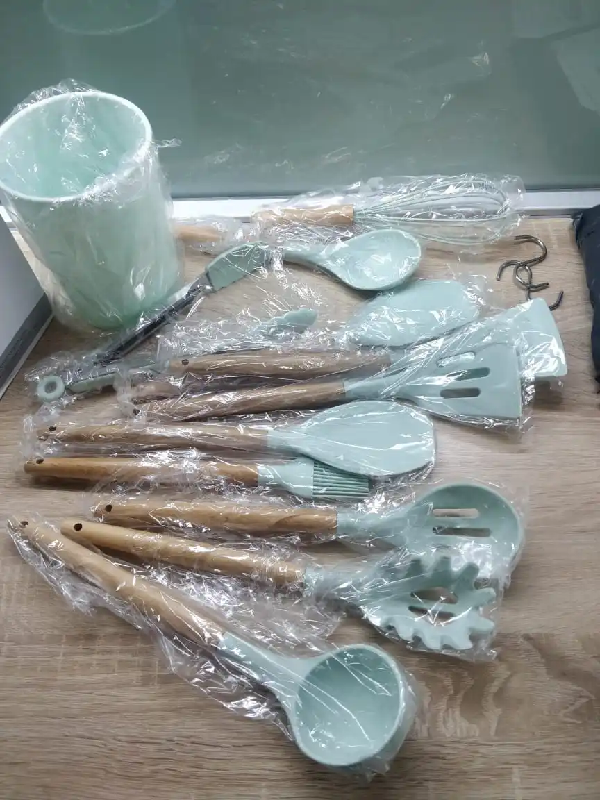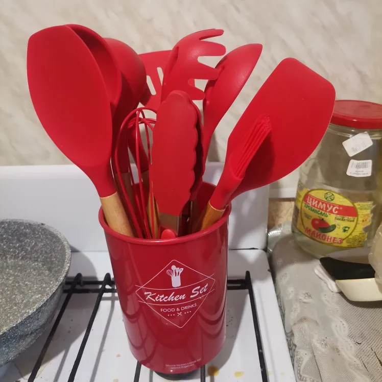 Спасибо, очень симпатичный набор красного цвета. Все смотрится аккуратно, лопатки-ложки-поварешки на все случаи жизни. Все из силикона, а ручки деревянные. Доставлено очень быстро. Спасибо продавцу и всем причастным. Да, пока немного попахивает, но, думаю, скоро выветрится.