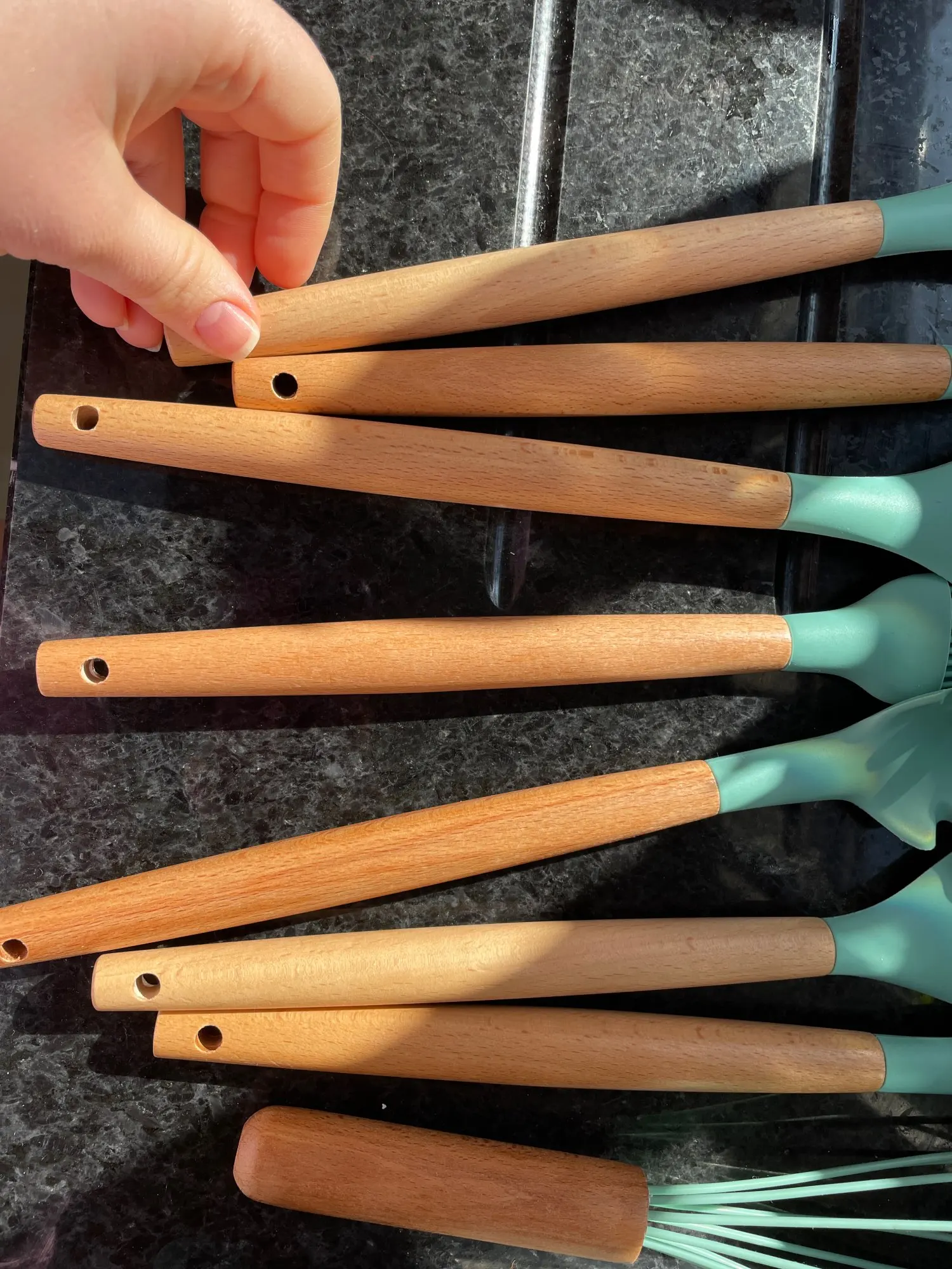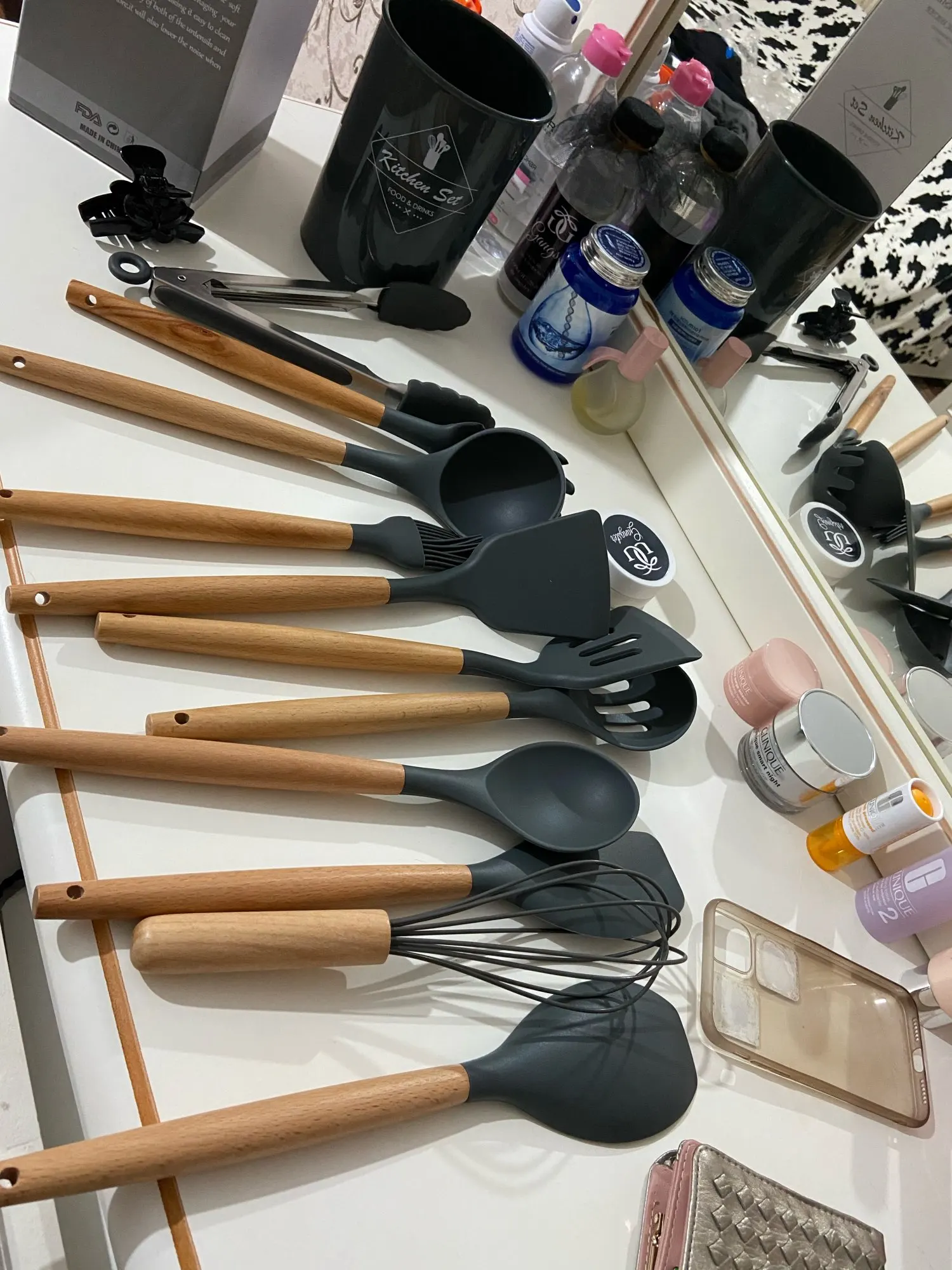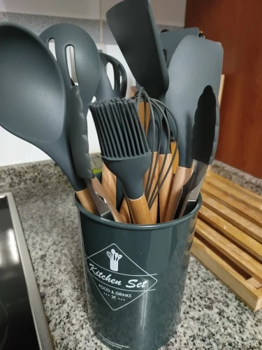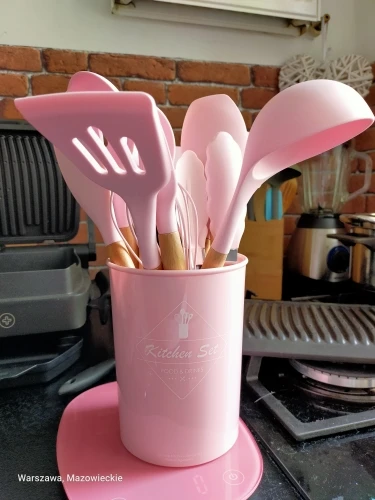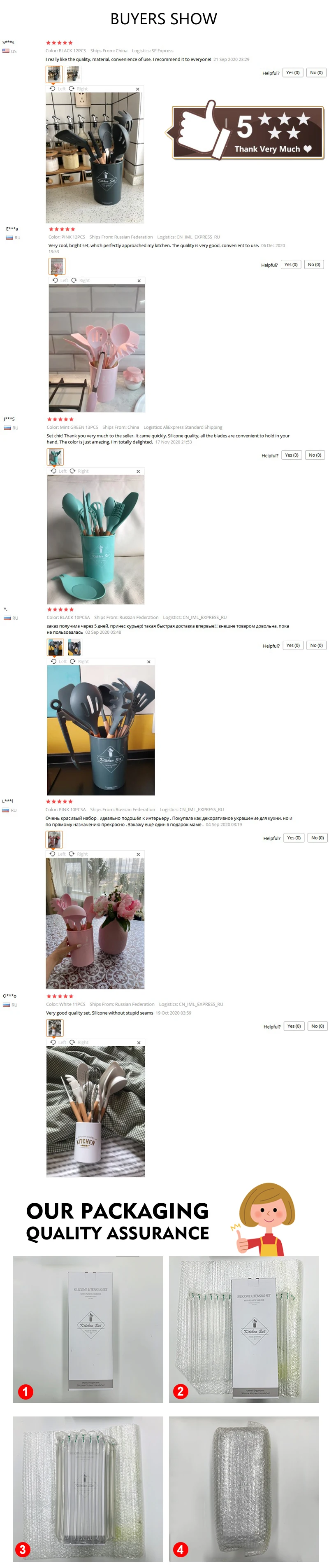 Спасибо, очень симпатичный набор красного цвета. Все смотрится аккуратно, лопатки-ложки-поварешки на все случаи жизни. Все из силикона, а ручки деревянные. Доставлено очень быстро. Спасибо продавцу и всем причастным. Да, пока немного попахивает, но, думаю, скоро выветрится.