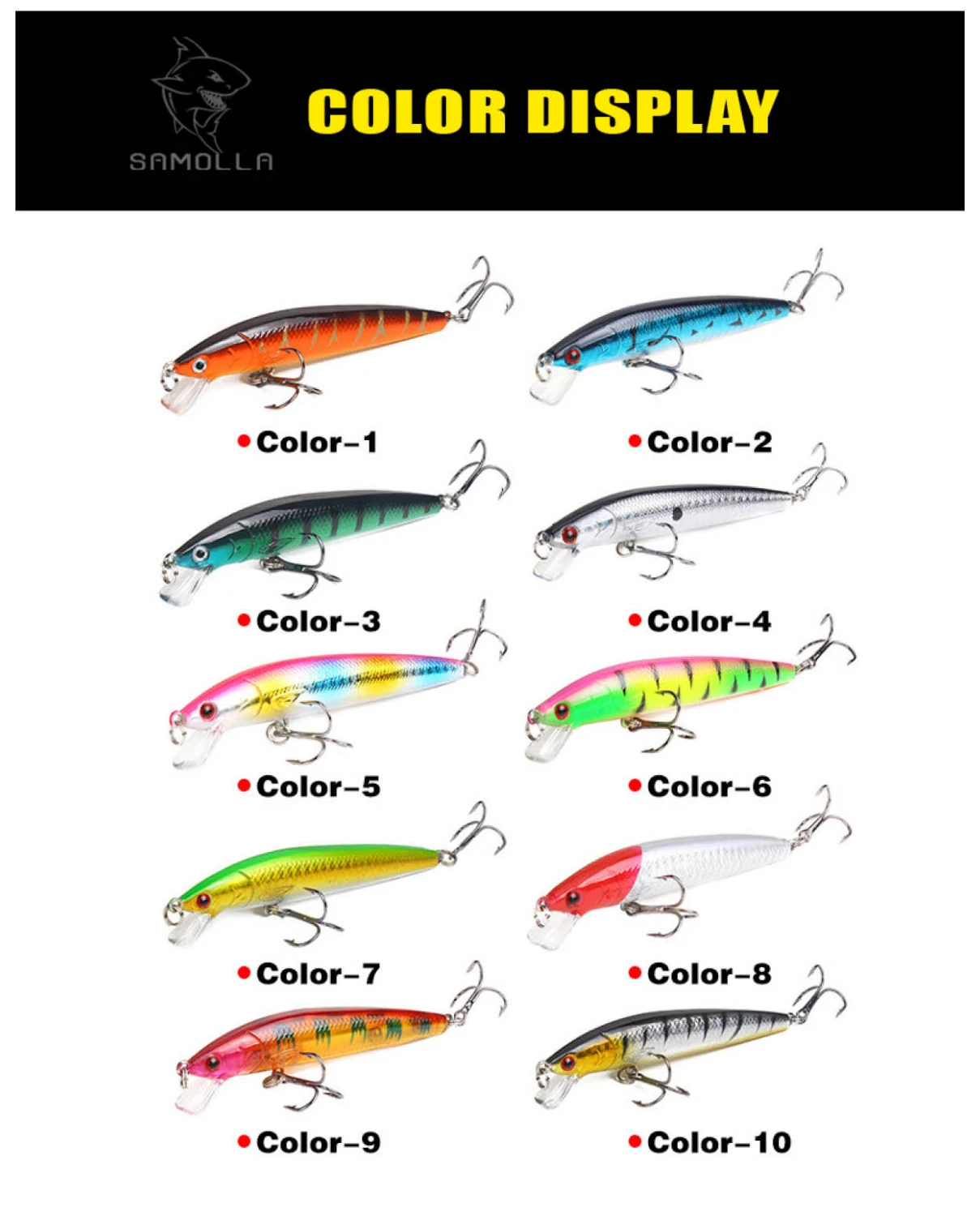 Информация о продукте: Бренд: SAMOLLA Модель приманки: Minnow Тип приманки: жесткая рыболовная приманка Приманка Вес: 7,5 г Длина приманки: 100 мм Глубина погружения: 0,5-1,5 м Плавучесть: Topwater Крючки: оснащены антикоррозийными крючками Глаза: 3D рыбий глаз Кольца: велосипедные Цвета: 10 цветов