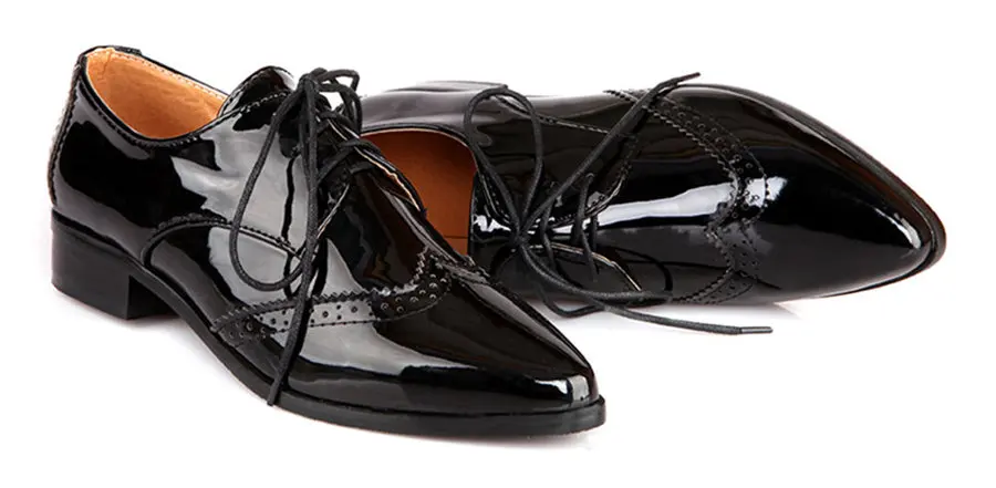 Демисезонные женские туфли-оксфорды из лакированной кожи на плоской подошве с острым носком
