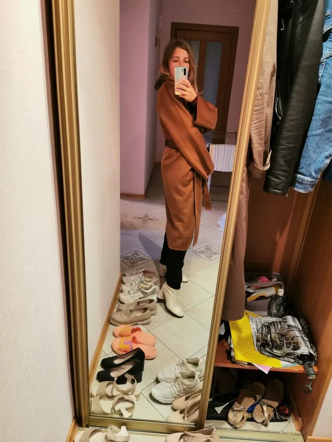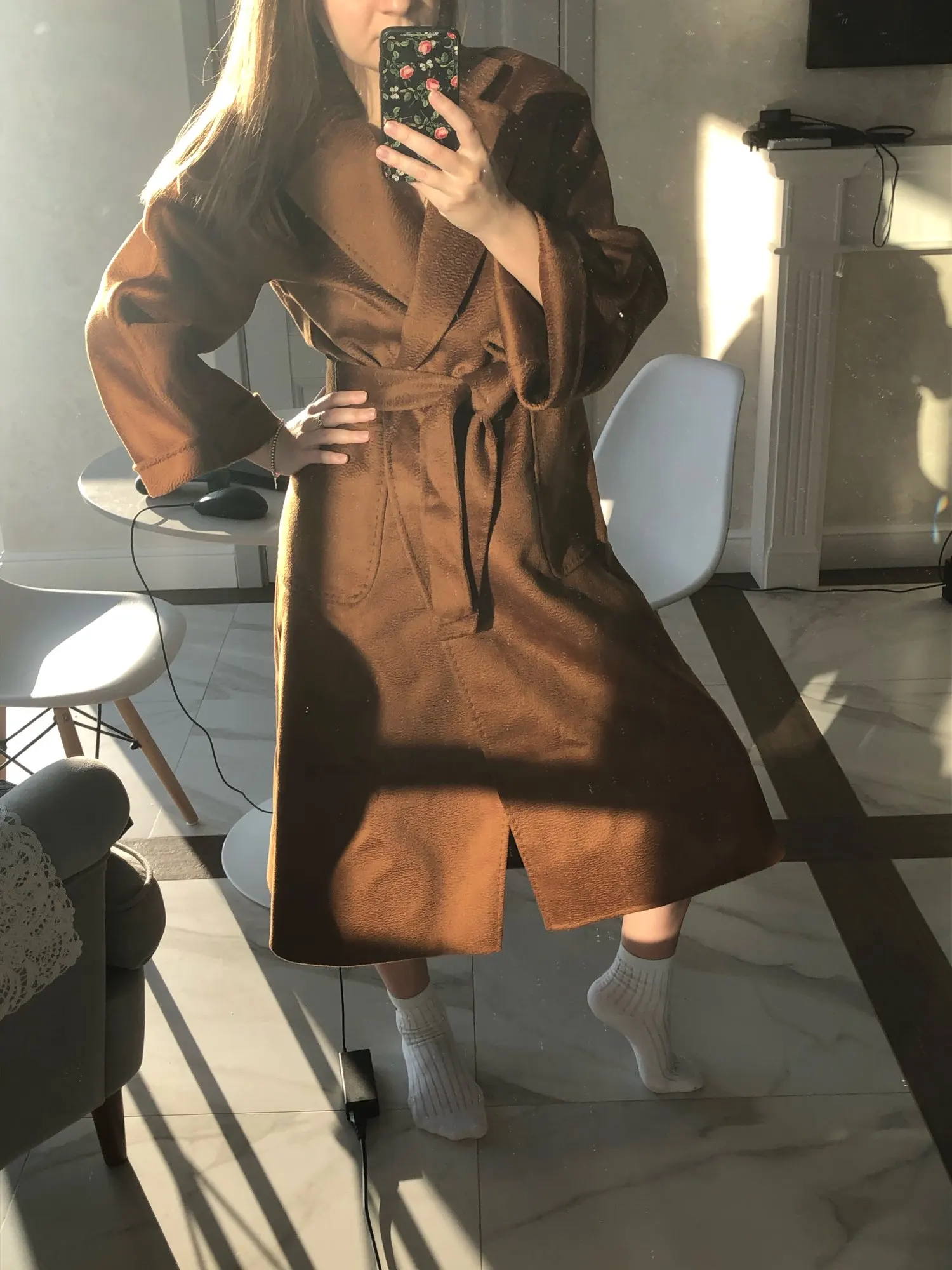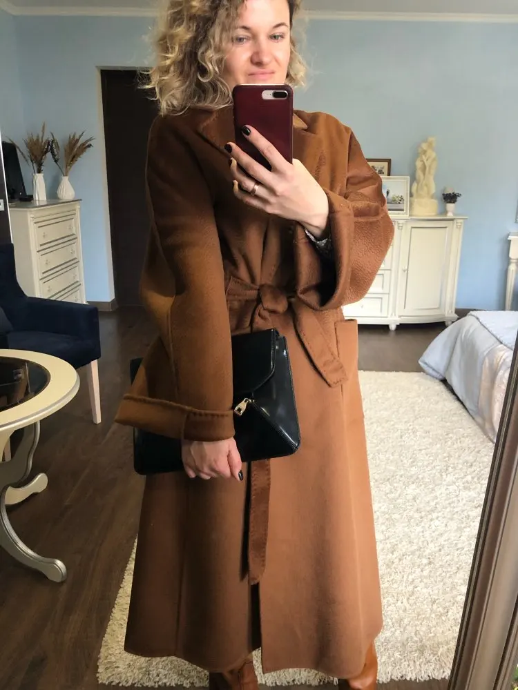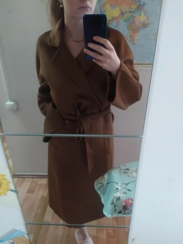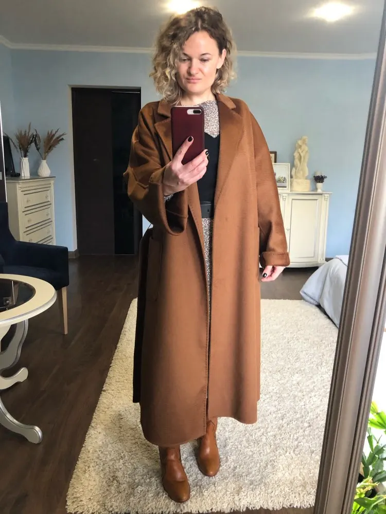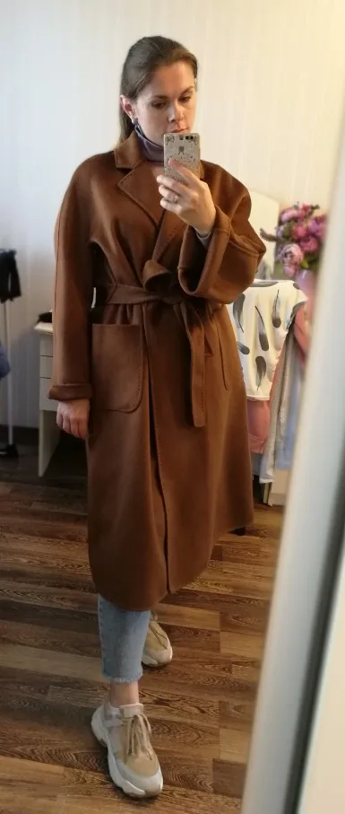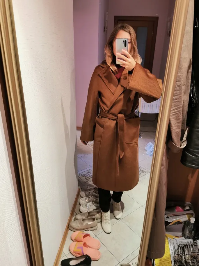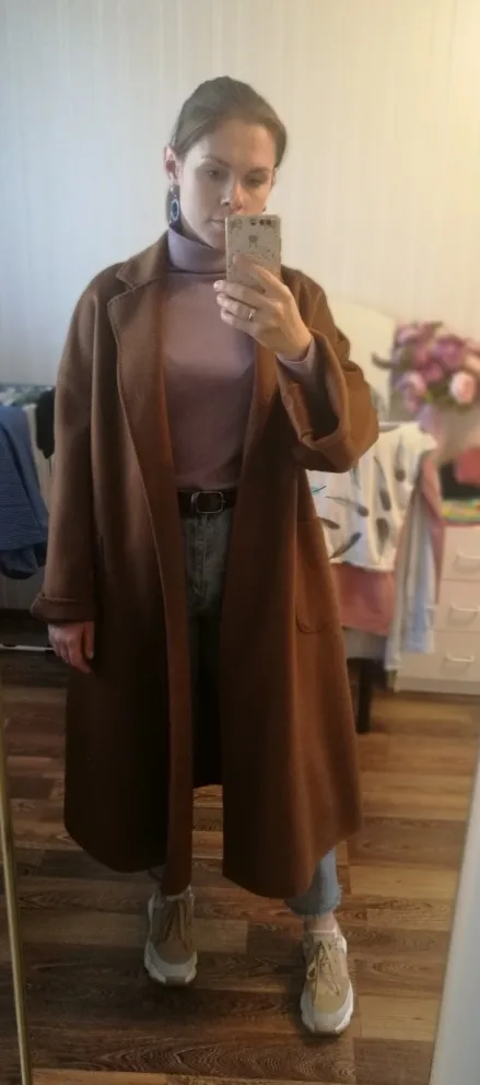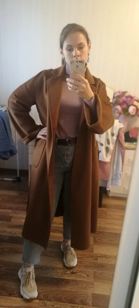 Пальто шикарное! На свой 42-44 взяла М, чтобы спокойно носить на свитера и толстовки. Не пожалела! На рост 167 все рукава, пояс идеально сели. Цвет просто идеальный camel. Супер быстрая доставка до МО меньше чем за 10 дней. Единственное, что, мне не показалось тёплым, от машины до машины в +5. Чуть позже буду носить на тонкий пуховик.