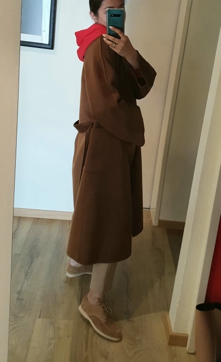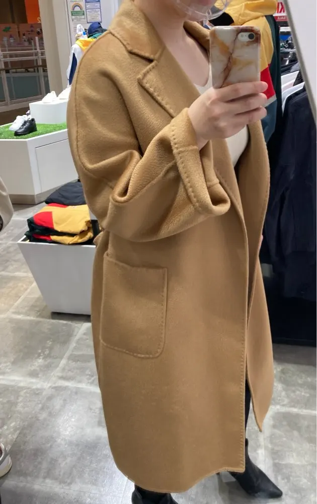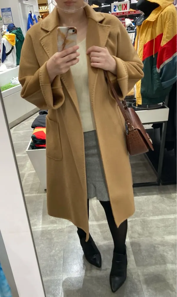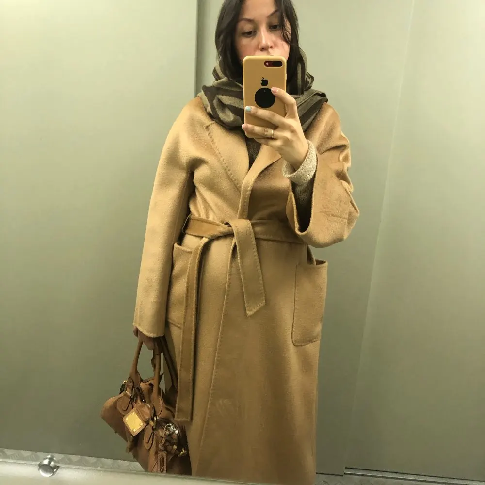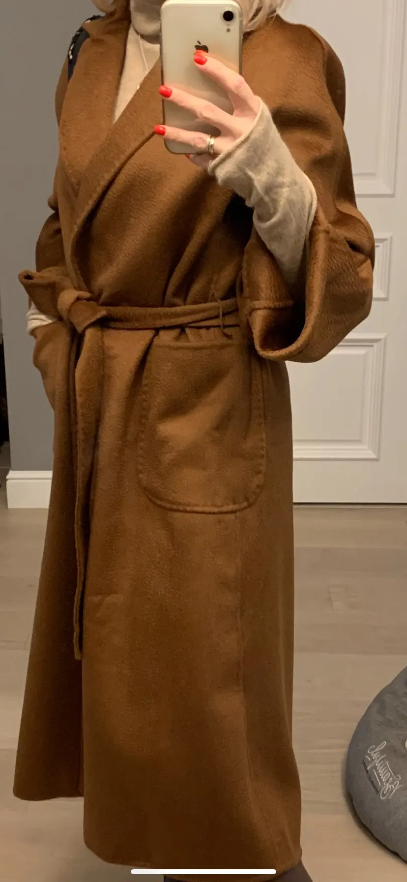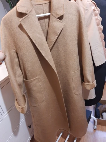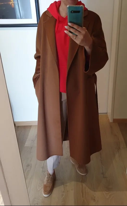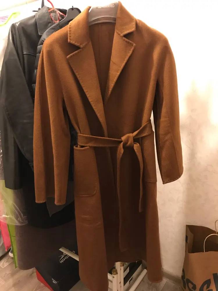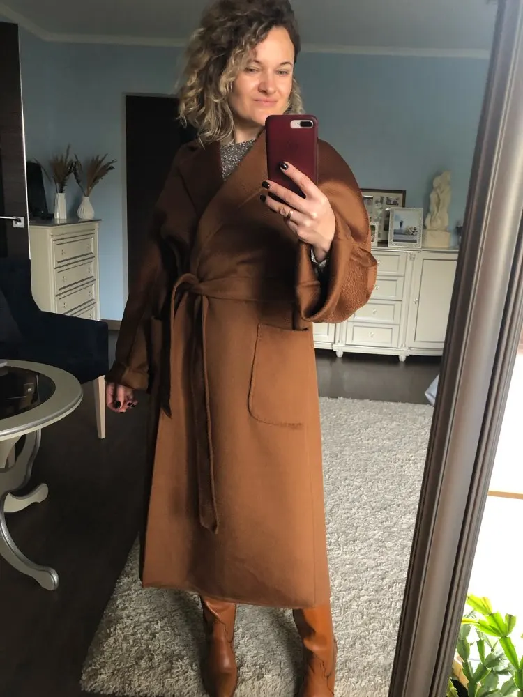 Пальто шикарное! На свой 42-44 взяла М, чтобы спокойно носить на свитера и толстовки. Не пожалела! На рост 167 все рукава, пояс идеально сели. Цвет просто идеальный camel. Супер быстрая доставка до МО меньше чем за 10 дней. Единственное, что, мне не показалось тёплым, от машины до машины в +5. Чуть позже буду носить на тонкий пуховик.