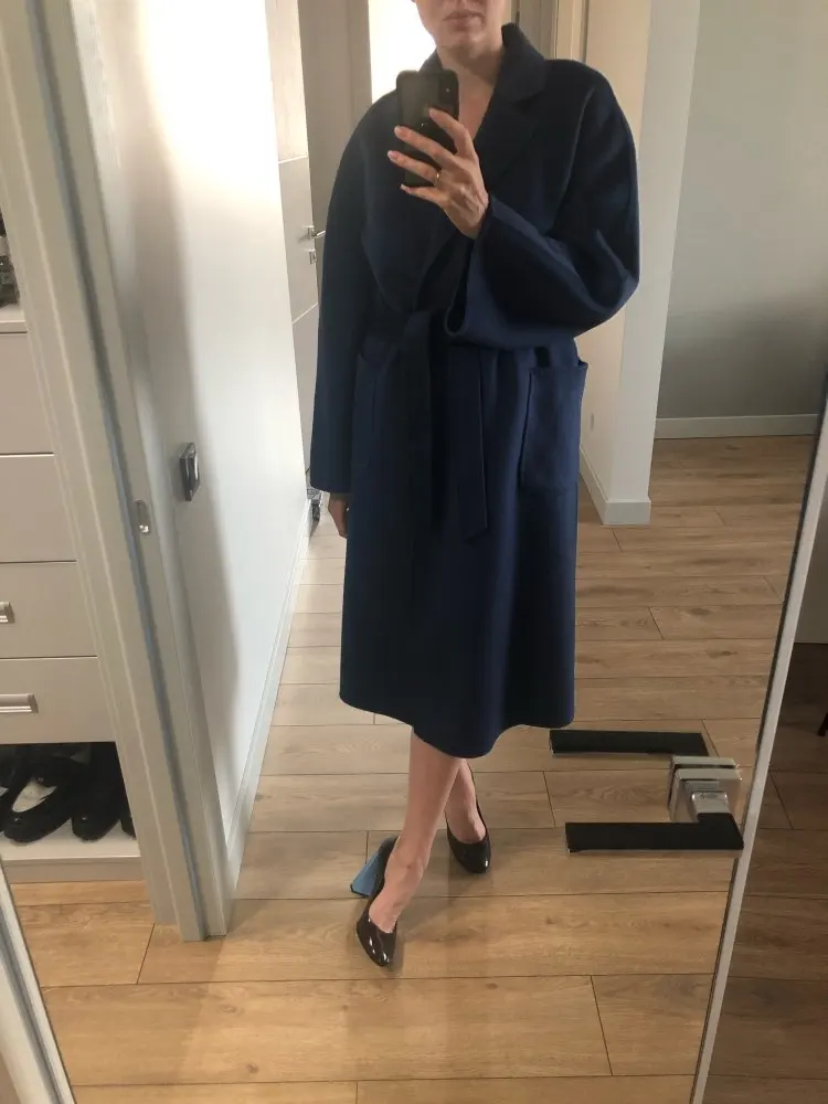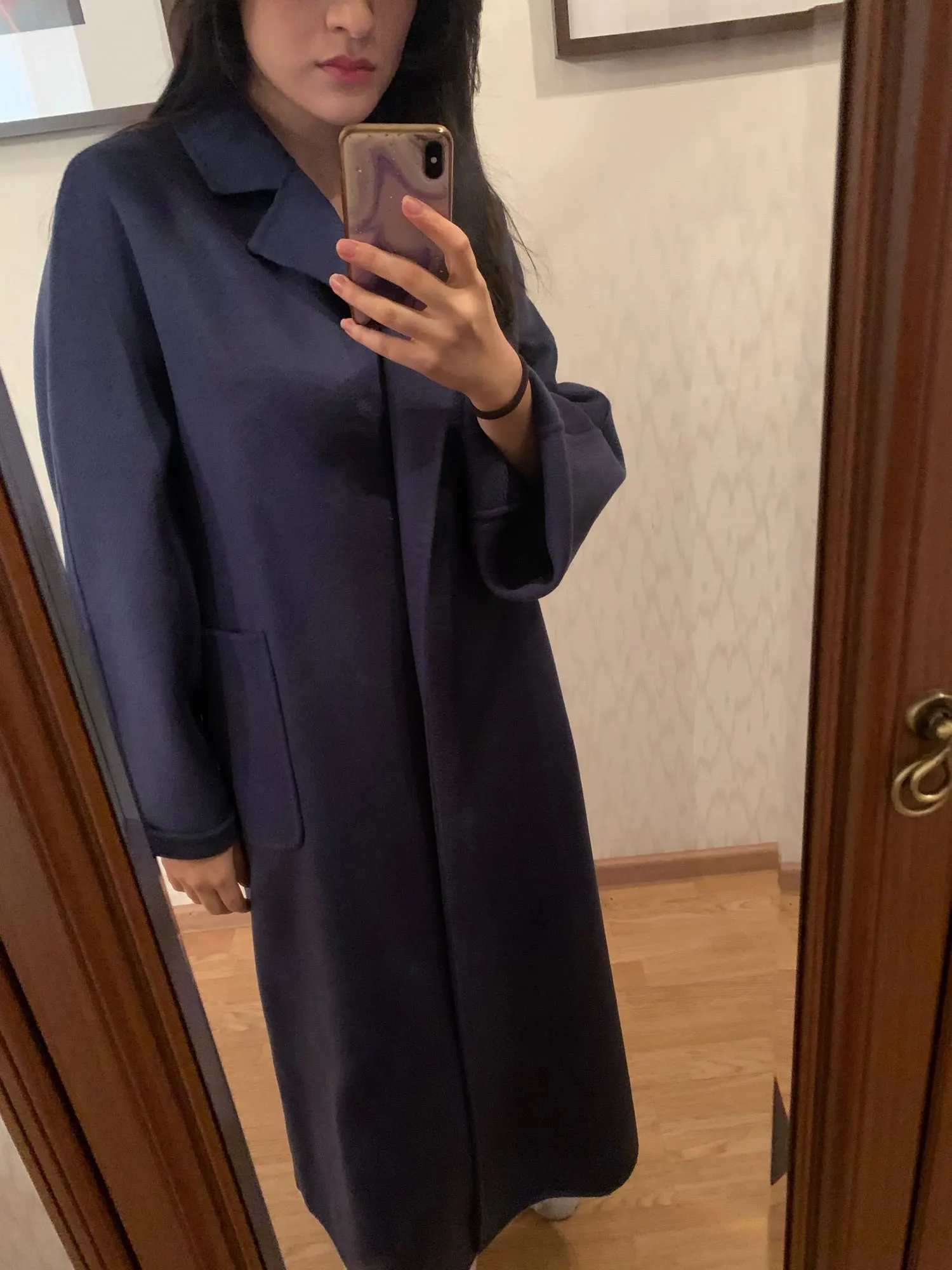 Нереально быстрая доставка. Все было упаковано аккуратно и надежно. В подарок прислали щетку, отдельное спасибо продавцу. Цвет более глубокий синий чем на фотографии. Выглядит очень дорого. Пальто брала М, размер подошел как нужно. У меня верх 44, так что легко можно и объёмный свитер одеть под пальто и жилет пуховой или толстовку. Ткань плотная, мягкая, прошито очень аккуратно. Строчки ровные, нитки не вылезают. По составу ткани : кашемир 6.9%, остальное шерсть. Но ткань очень мягкая и приятная. Пальто без застежек на поясе. Мой рост 168 см и если я завязываю пояс, то карманы попадают под пояс. Линия талии на которой закреплены петли пояса думаю где-то на рост 165см. Буду пришивать большую кнопку и пояс завязывать сзади. Пальто очень красивое, нет ощущение громозкости. Легкое и теплое. Очень довольна, что заказала синий цвет. Спасибо продавцу за молниеносную доставку. Очень довольна.