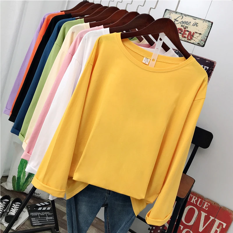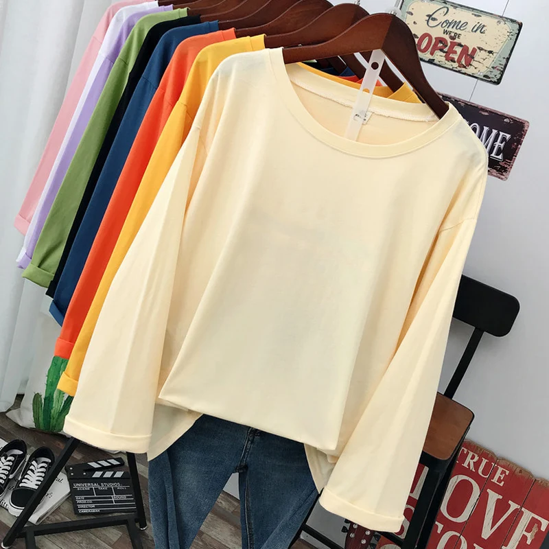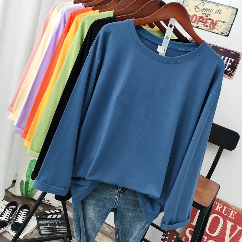 Весенне-осенняя женская однотонная футболка высокого качества с длинным рукавом, свободная повседневная одежда унисекс из чистого хлопка с круглым вырезом