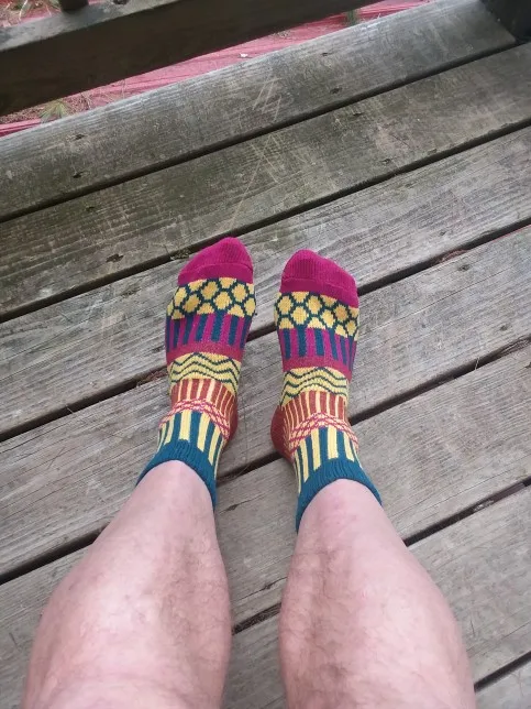 Die Socken sehen nicht schlecht aus. Das Material ist aber eine Kunstfaser und lässt die Füße schwitzen.