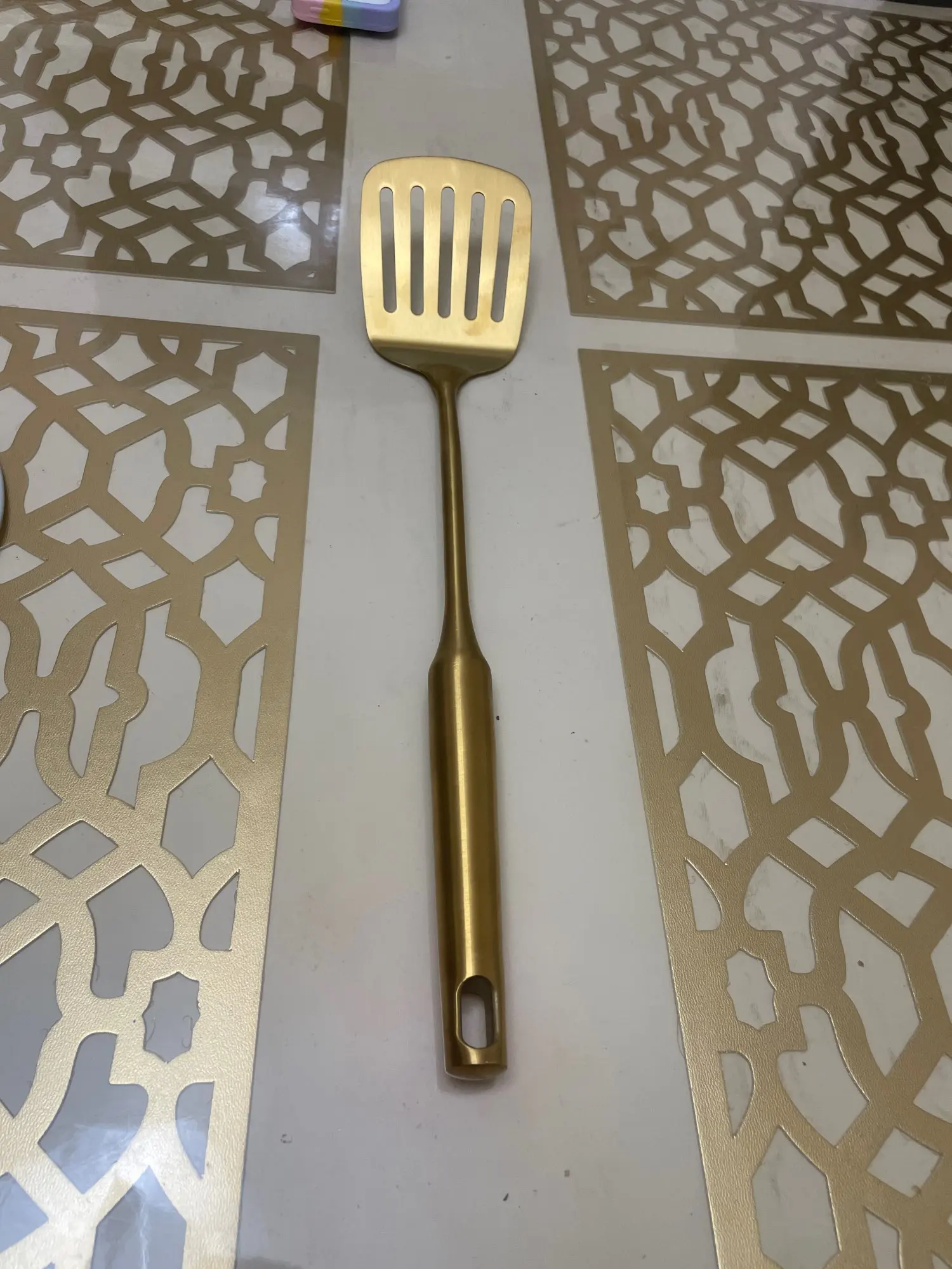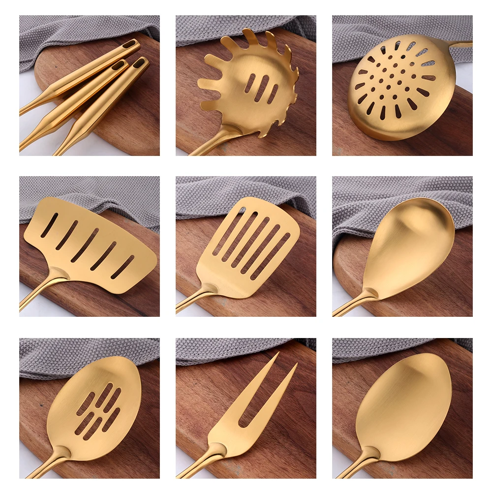 Золотая посуда, инструменты для приготовления пищи из нержавеющей стали, лопатка, ковш, ложка, дуршлаг, фильтр, картофелерезка, кухонная утварь