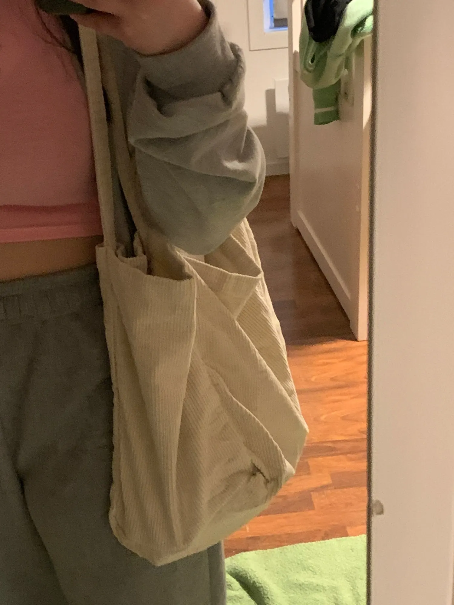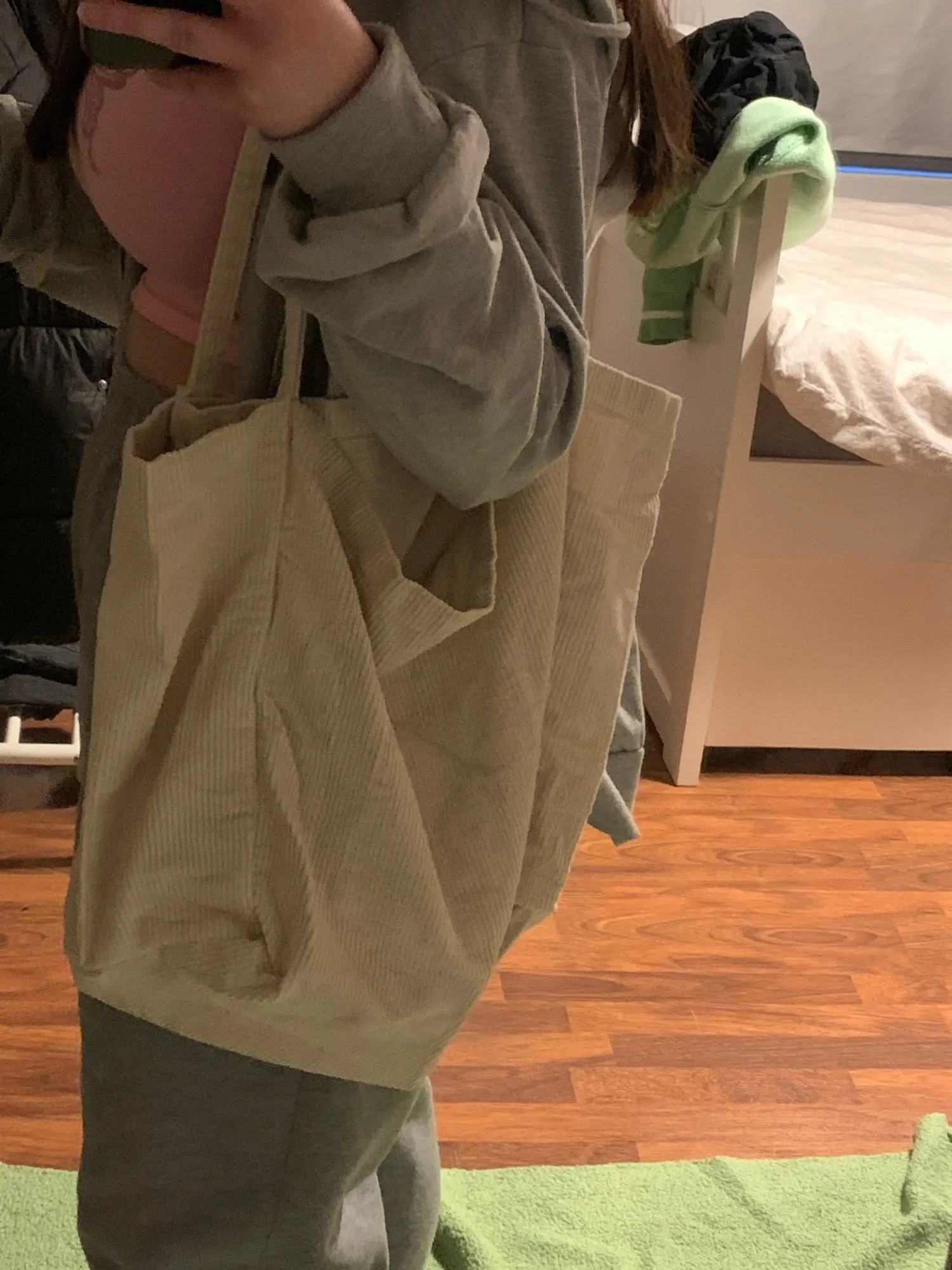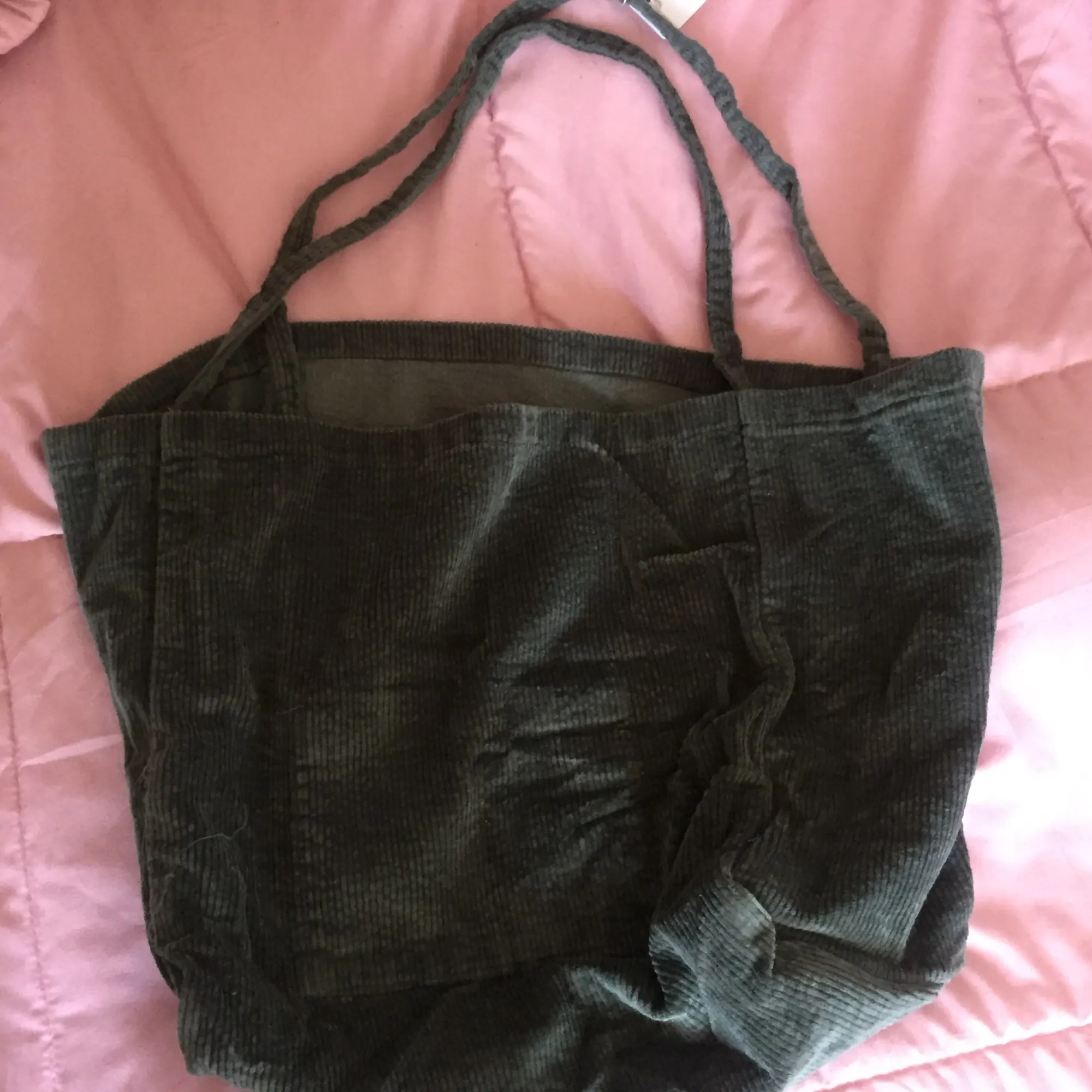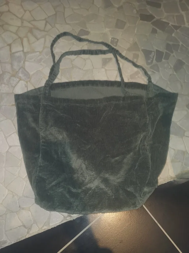 Описанию соответствует, очень вместительная, ткань стрейч. Цвет очень удачный серо-зелёный. Внутри карман. Был небольшой брак- неровный шов на ручке, плохо подвернута ткань- можно подшить. За брак получила от Али компенсацию, какую просила, продавец предлагал выслать новую. В целом покупкой довольна, брак -дело случая.
