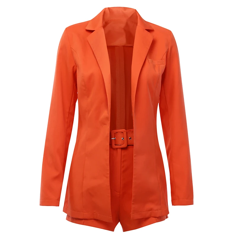 Женские офисные повседневные короткие костюмы, однотонный пиджак с длинным рукавом и ремень для шортов, Женская рабочая одежда, 2020