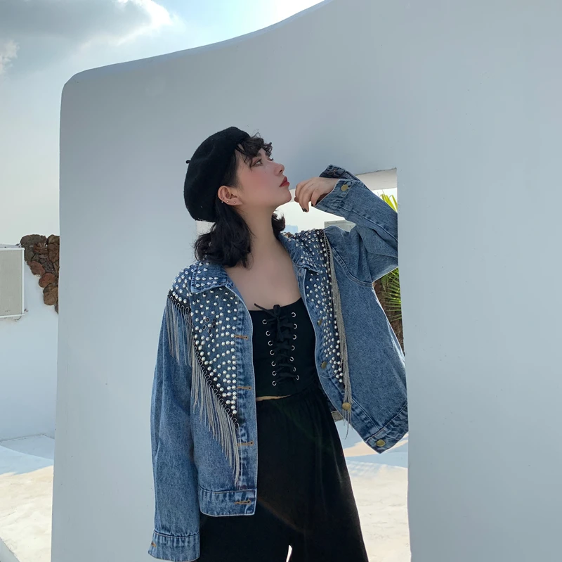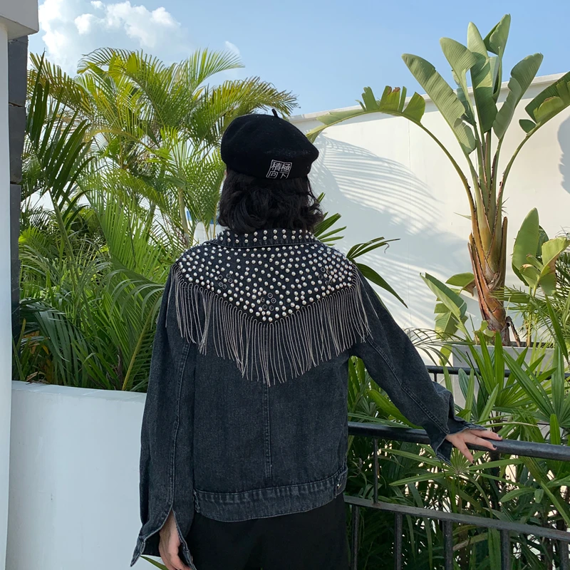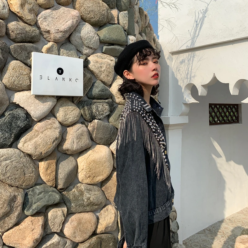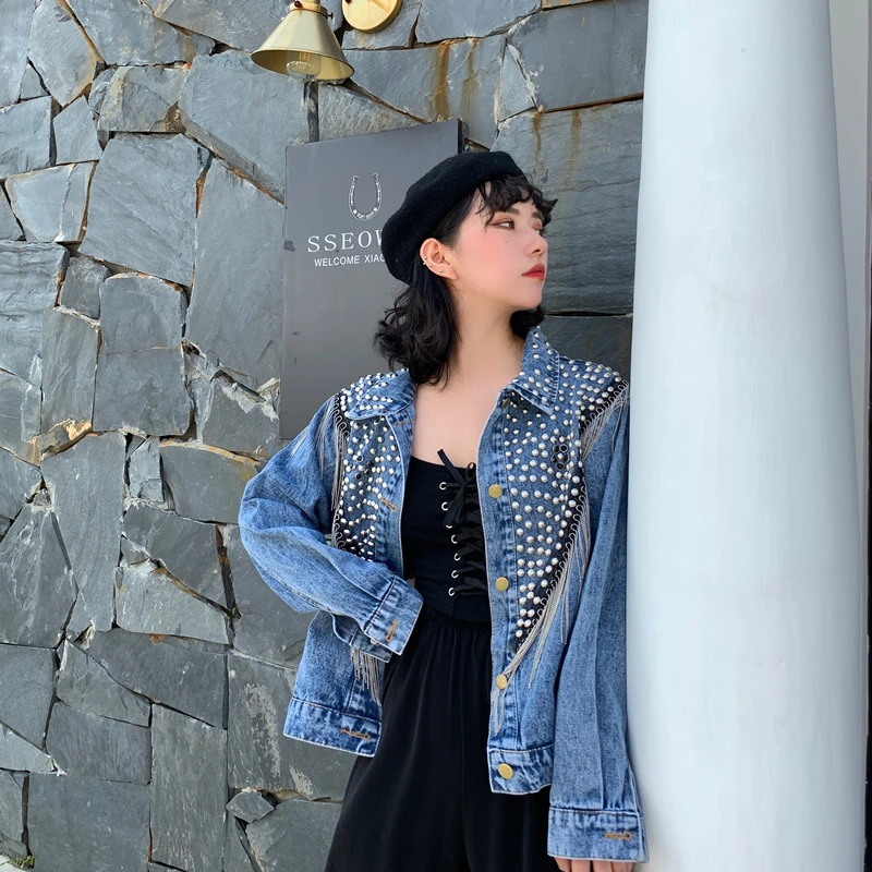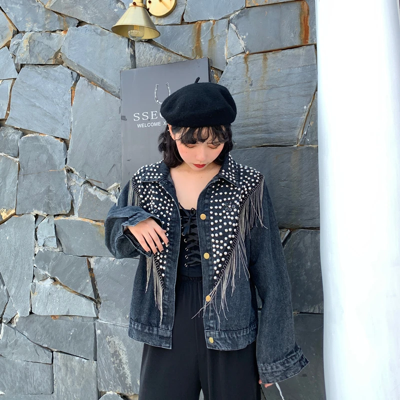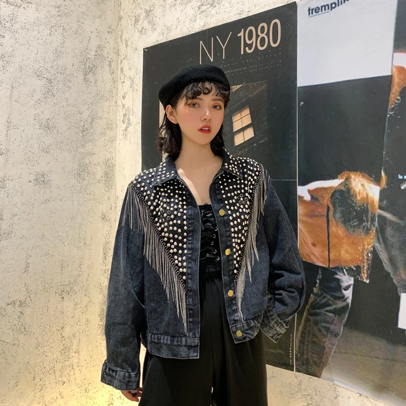 Женская короткая джинсовая куртка, свободная осенняя куртка с заклепками и кисточками на цепочке, уличная одежда, 2020