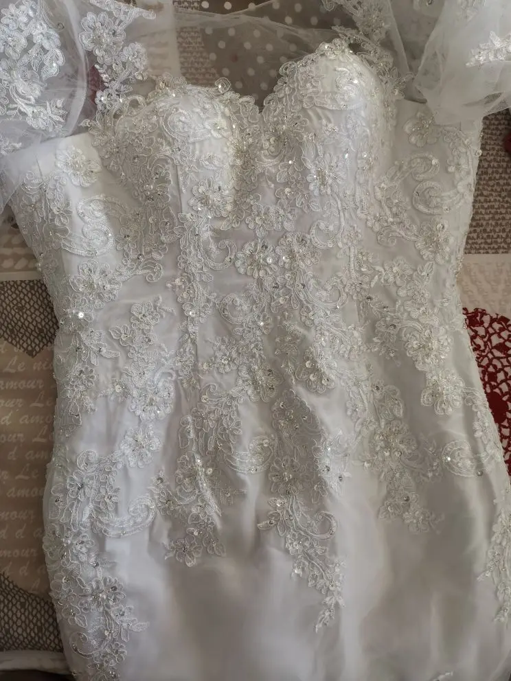 Я на самом деле в восторге. Очень ответственная и она на самом деле уделяет внимание таможенным измерениям. Обожаю это платье. Очень красиво. Я купил его с подходящей вуалью для собора 5 м. Мне нравится то, что они не такие тяжелые, как другие свадебные платья. Он очень легкий, когда вы его носите. Я полностью рекомендую ее магазин!