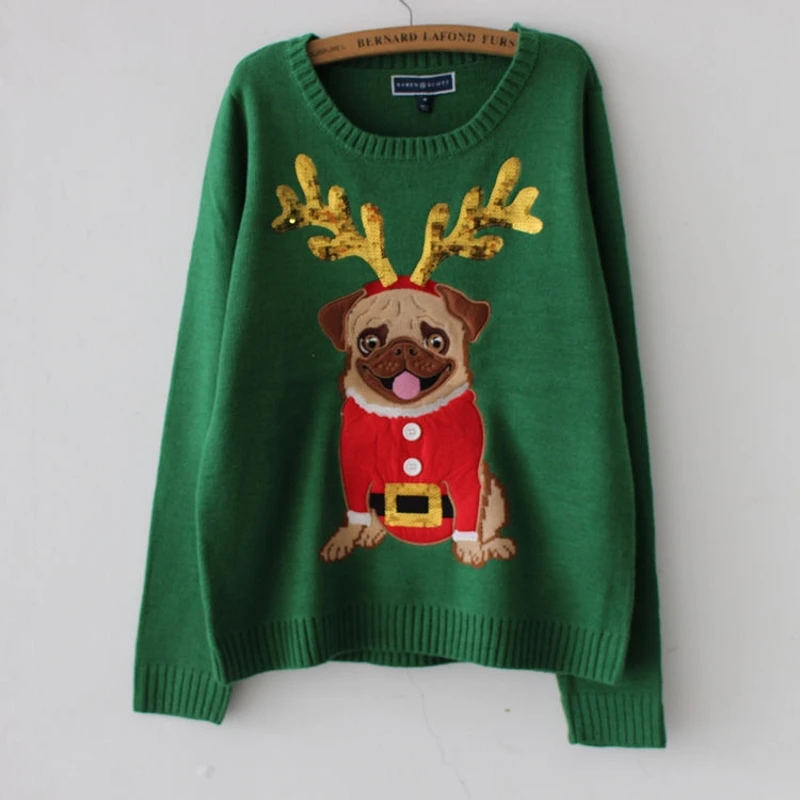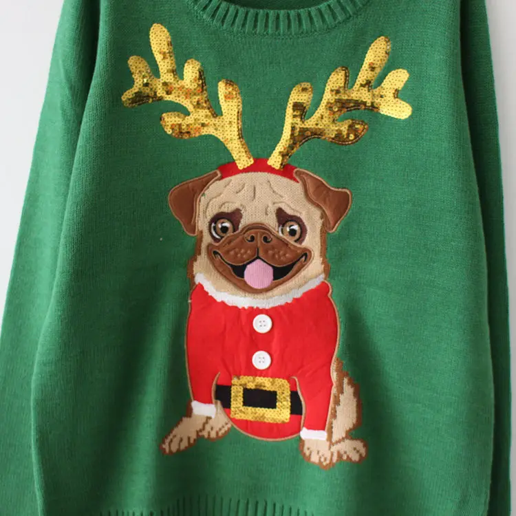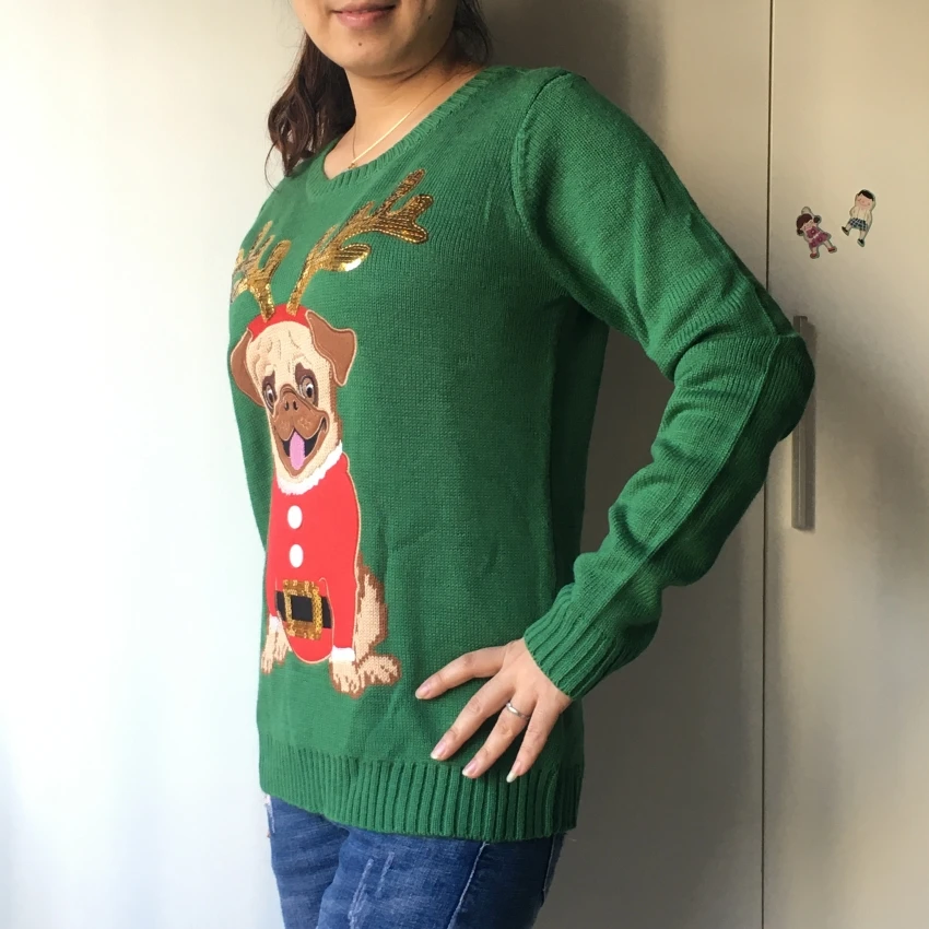 Свитер Женский вязаный, с вышивкой в виде мопса, с блестками