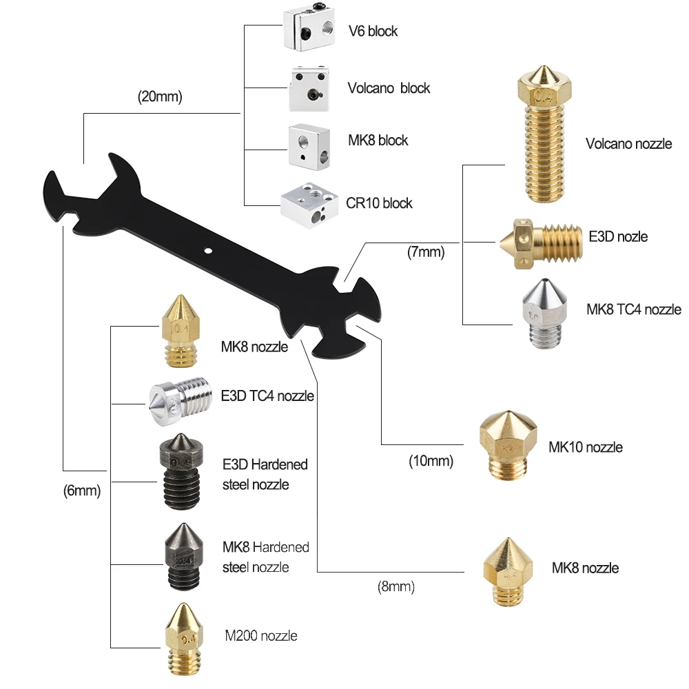 Гаечный ключ 5 в 1, стальной гаечный ключ размером от 6 до 20 мм, плоский инструмент для сопла E3D MK8 MK10, детали для 3D-принтера