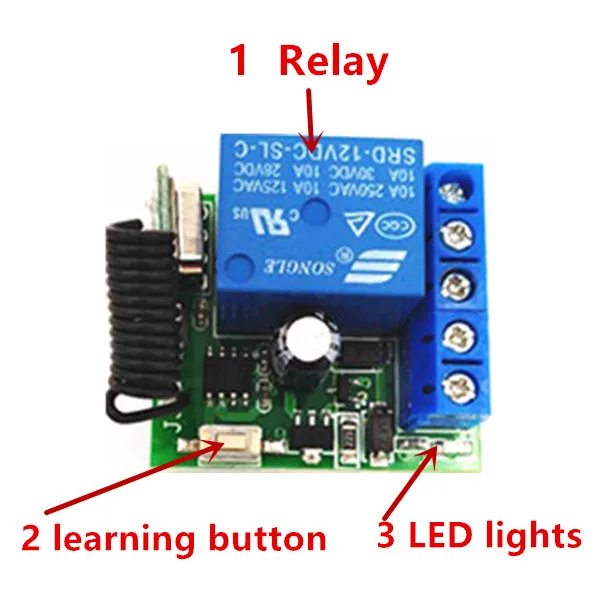 Нажмите кнопку Learn на приемнике семь раз в ряд. Когда светодиод горит, нажмите кнопку дистанционного управления D, которая должна быть сопряжена. Светодиод на плате приемника мигает три раза, чтобы показать, что код успешно кодирован.