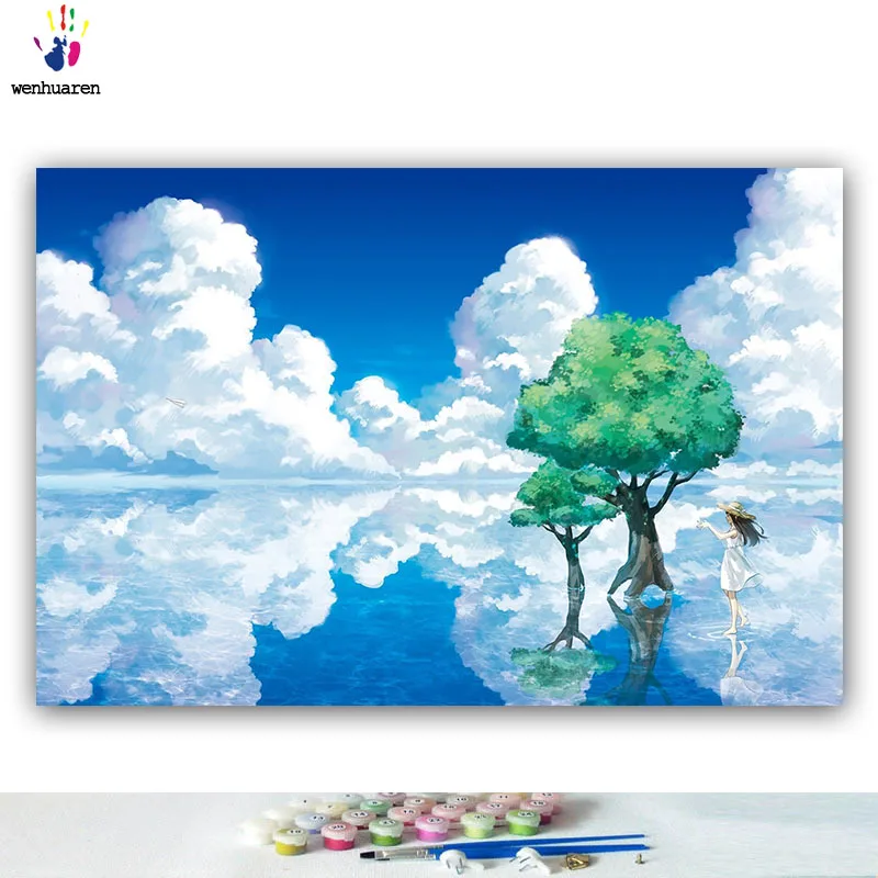 Картинки для раскраски по номерам сделай сам, иллюстрация с облачно-голубым пейзажем, живопись по номерам в рамке для дома