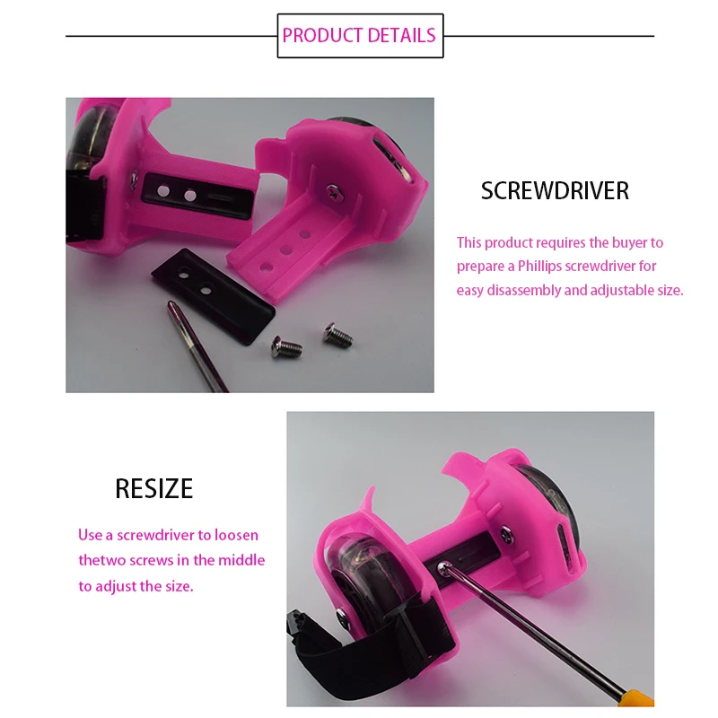 Регулируемый Мигающий Ролик можно отрегулировать через крестовой ключ (не входит в комплект). Есть три отверстия, чтобы вы могли изменить в соответствии с практической ситуацией. Красочный Каждый владеет четырьмя цветными лампочками. Когда колеса продолжаются, световой эффект Прохладный в темноте. Безопасный Конструкция пряжки позволяет плотно фиксировать ногу на ролике для обеспечения безопасности использования. Дно состоит из металлической панели, которая долговечна и безопасна в использовании. Прочный Мигающий ролик изготовлен из высококачественного ПВХ-материала и высокопрочной углеродистой стали, износостойкой и гладкой в работе. Область применения Мигающий Ролик предназначен для детей, что может доставить вам счастливое время катания. Также его можно использовать в качестве подарка для ваших малышей. Спецификация: Тип: Мигающий Ролик Количество: 2 шт. Материал: ПВХ + TPR + углеродистая сталь Цвет: черный/розовый Источник светильник: 4 шт. Разносветильник Размер: 13*9 см/5,11*3,54 дюйма/(Д * Ш * В) Вес нетто: 610 г Комплектация: 2 * Мигающий Ролик Посылка вочная коробка