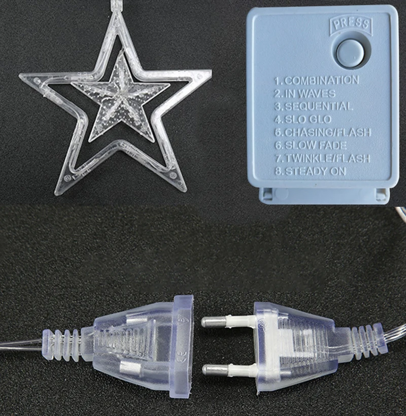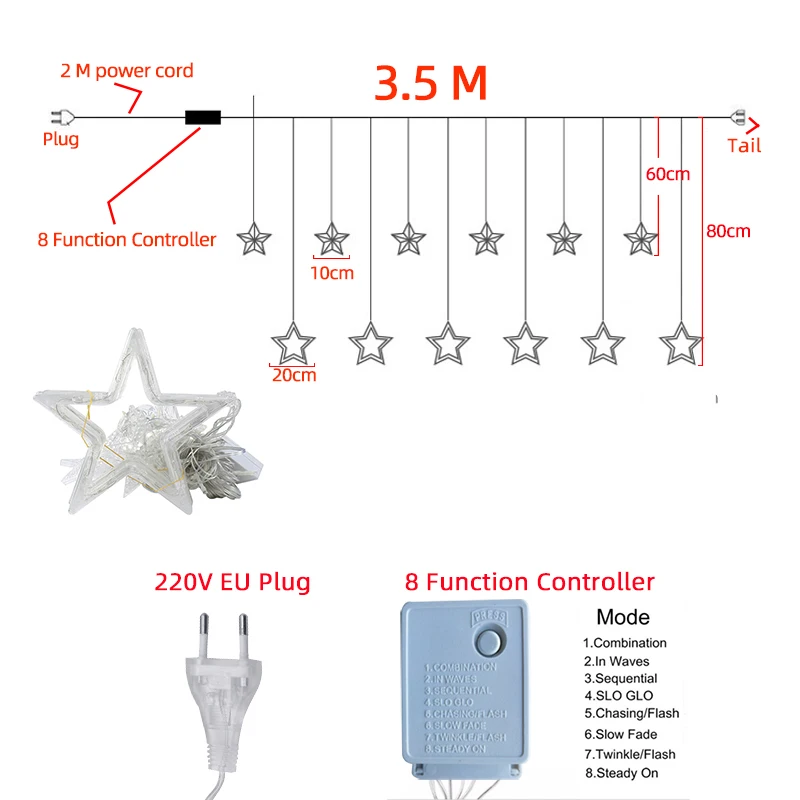 Напоминание:Светодиодный занавес звезды светильник с Подключите кабель переменного тока, длина кабеля составляет 1,5 метров. Если вы считаете, что 1,5 метров не хватает длины, пожалуйста, купите 3 метровый кабель отдельно.Ссылка на покупку: