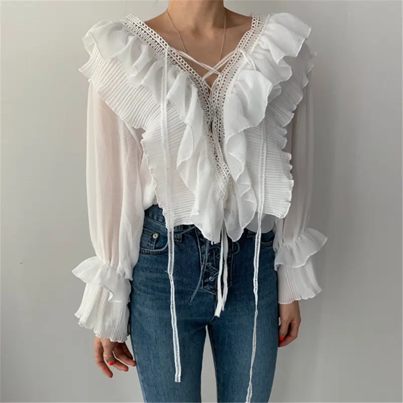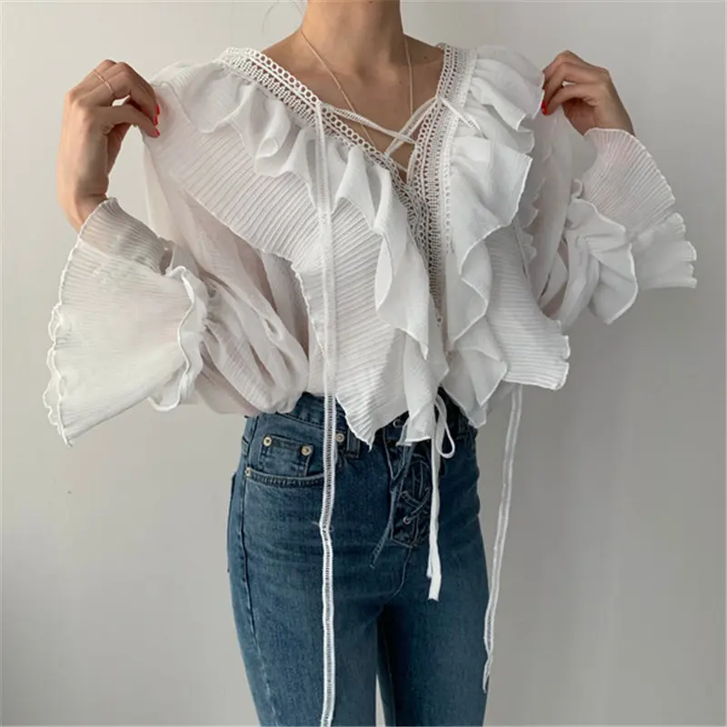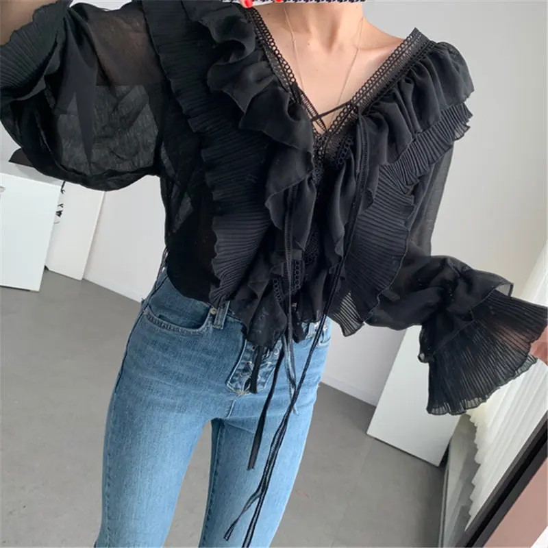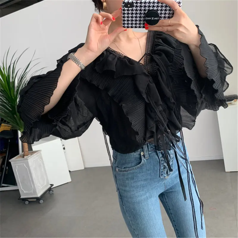 Женская Повседневная рубашка с рюшами Alien Kitty, универсальная свободная офисная рубашка с v-образным вырезом и расклешенными рукавами, осень