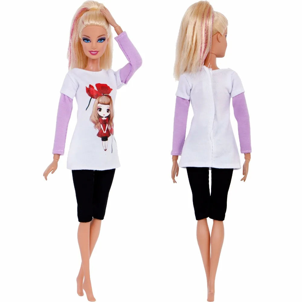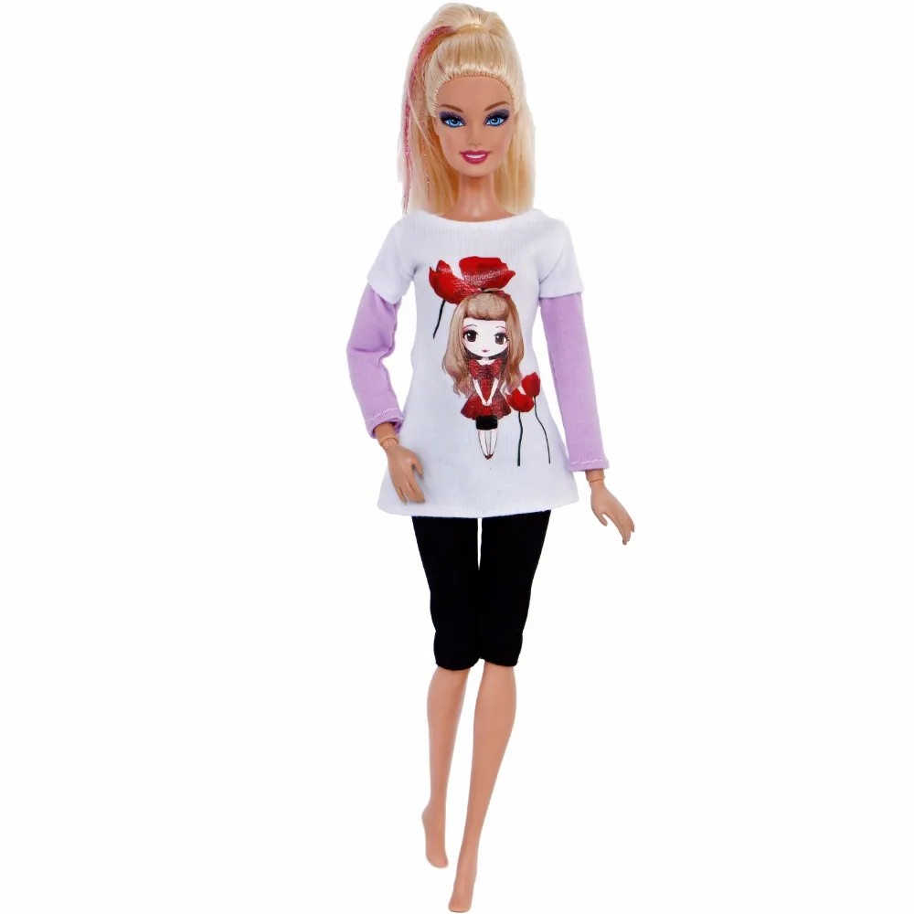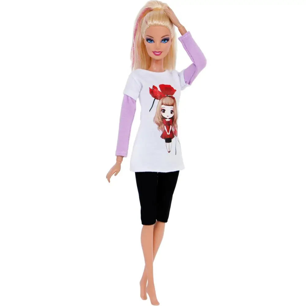 Милый 1 комплект, белая мультяшная розовая футболка с принтом, черные плотные штаны, повседневная одежда, аксессуары для куклы Барби, детская игрушка