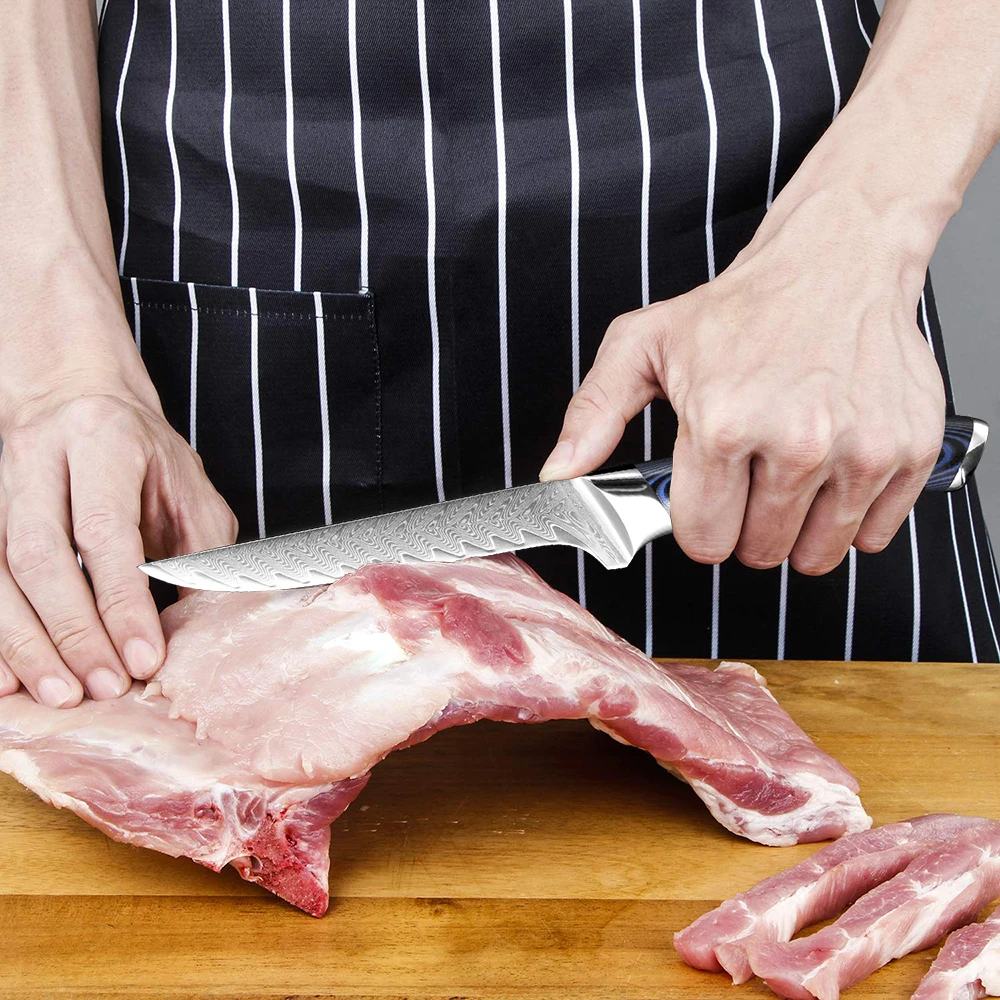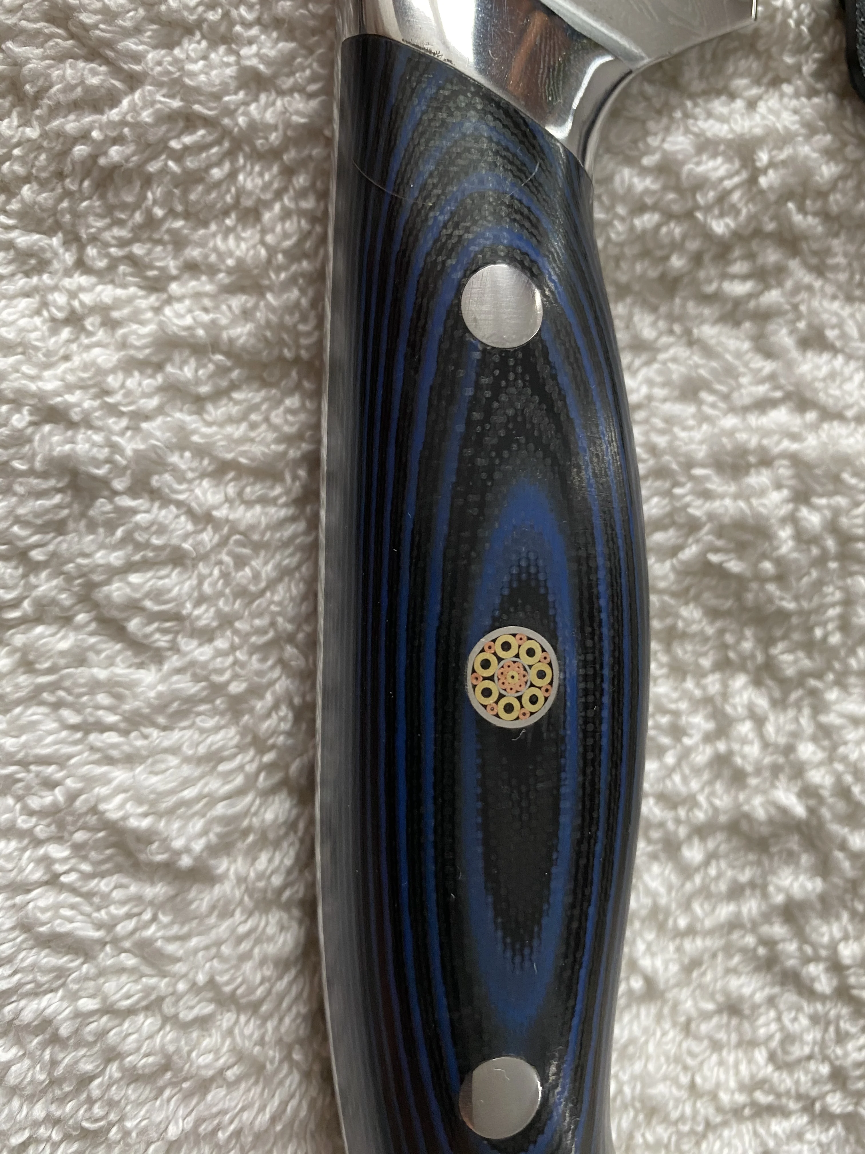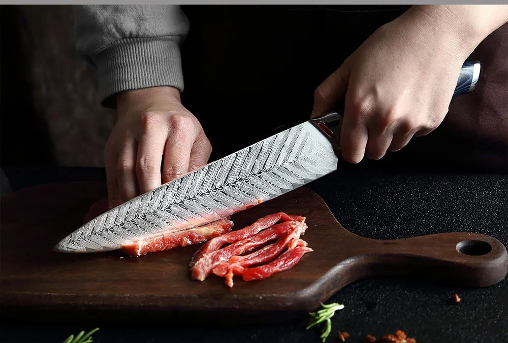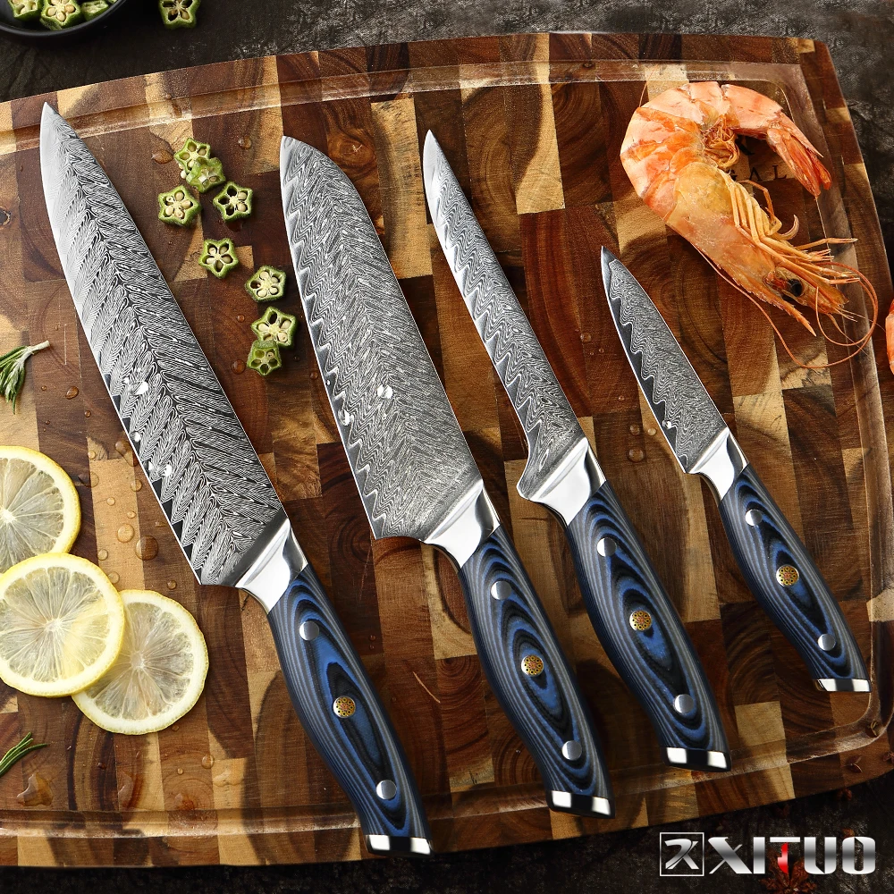 Очень хорошие ножи. Синий и черный G-10 гораздо более контрастны, чем другие ножи с синими и черными G-10. Узор в Дамаске красивый. Мозаичный штифт на ручках также выглядит красиво. Острые ножи. Я действительно хочу, чтобы было доступно больше стилей ножей, таких как 5-дюймовая утилита, 5-дюймовая сантоку и 6-дюймовая шеф-повара. С нижней стороны упаковка была не очень хорошей. Все 4 ножа были упакованы в коробку, в которую входит нож шеф-повара, и внутренний упаковочный материал был удален. Поскольку внутри не было упаковочного материала, во время доставки тяжелый нож шеф-повара проникал через пластиковую защитную пленку, конец коробки и внешнюю упаковку. Когда нож был доставлен, я мог видеть, что он приклеивается на 1 см. К сожалению, нож не был поврежден.