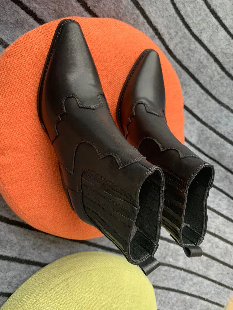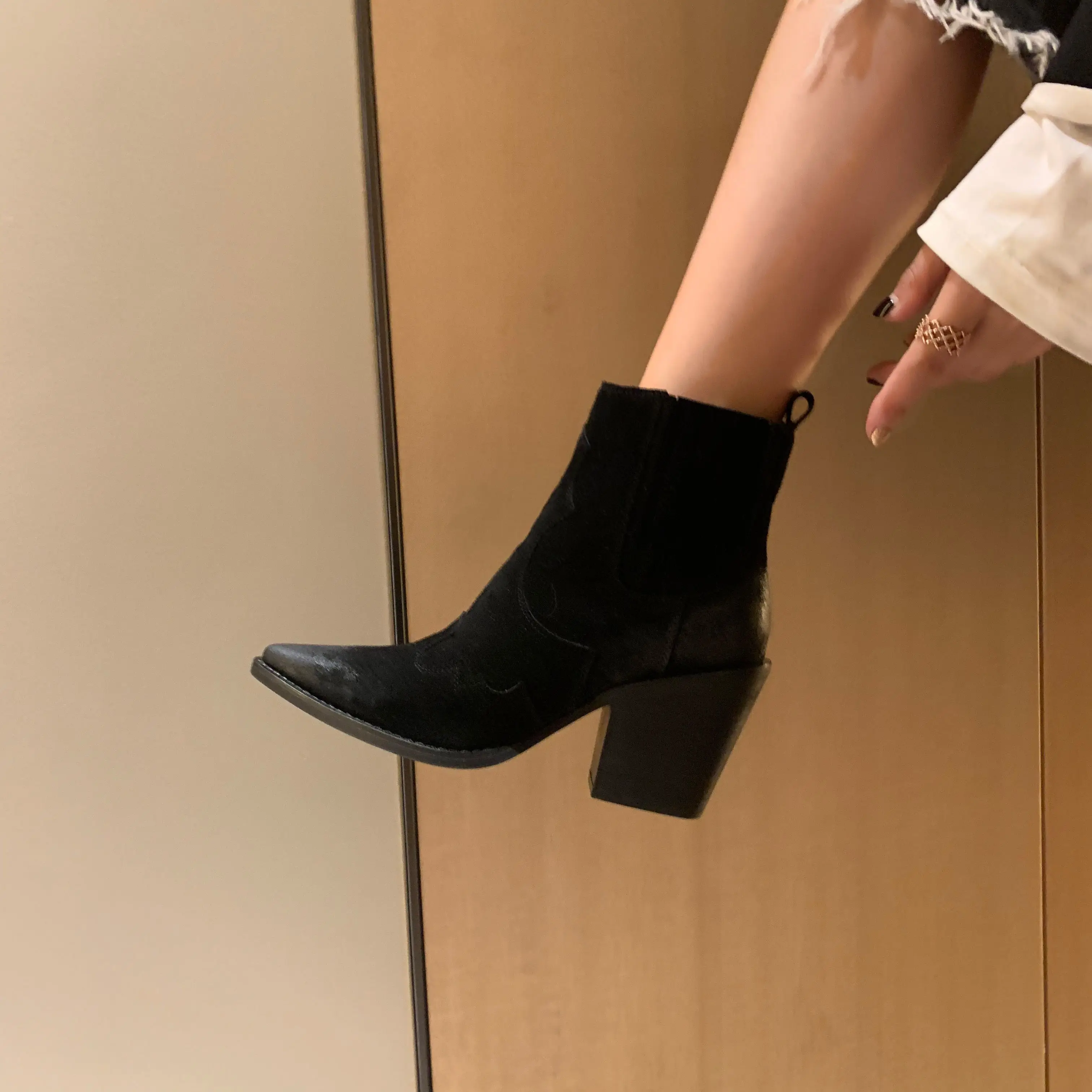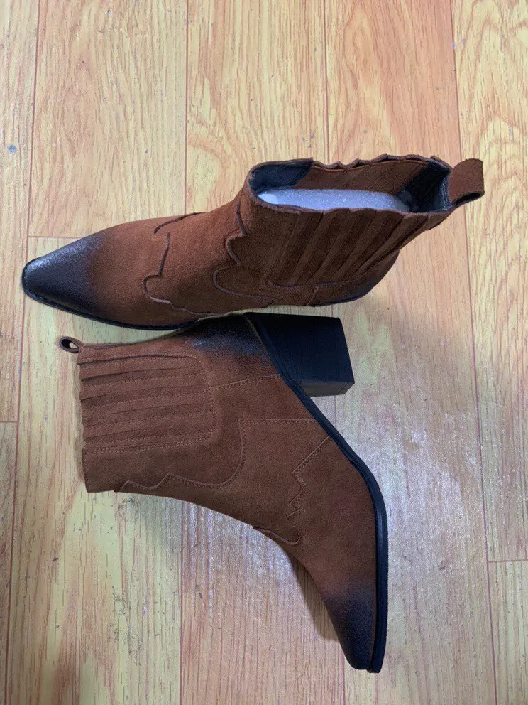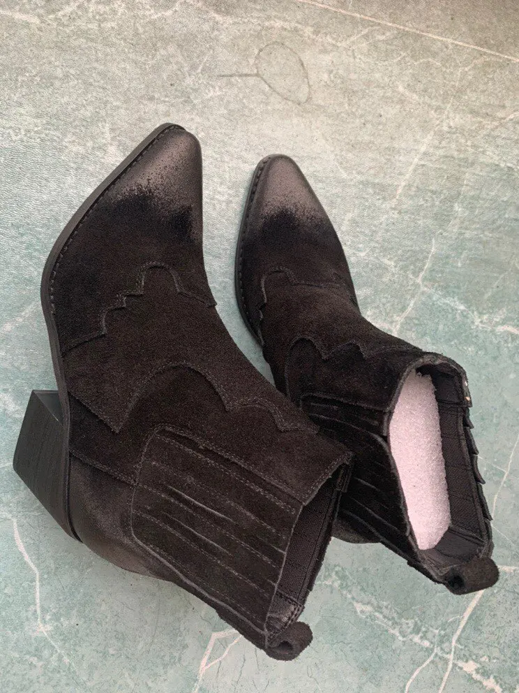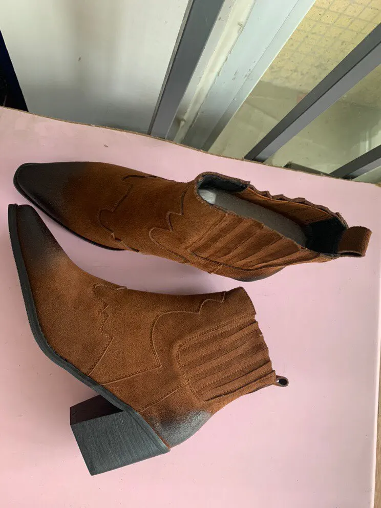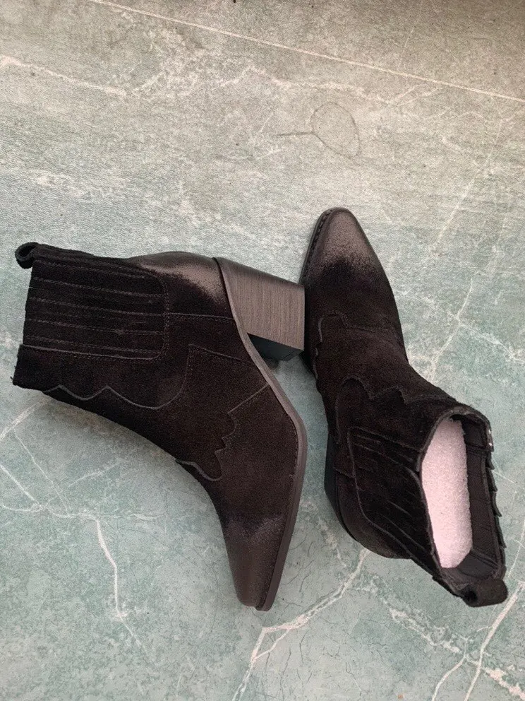 Ботинки женские из натуральной кожи, ботильоны на среднем толстом квадратном каблуке, с острым носком, без застежки, ковбойские сапоги в западном стиле