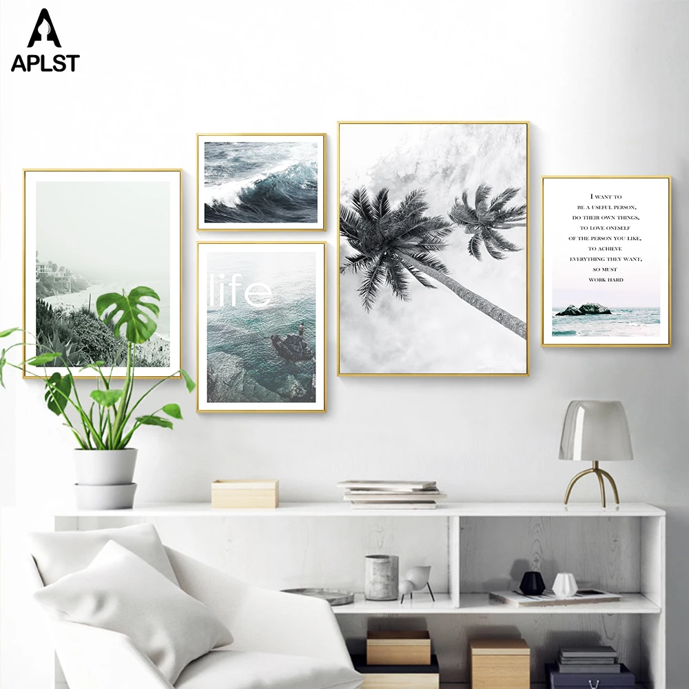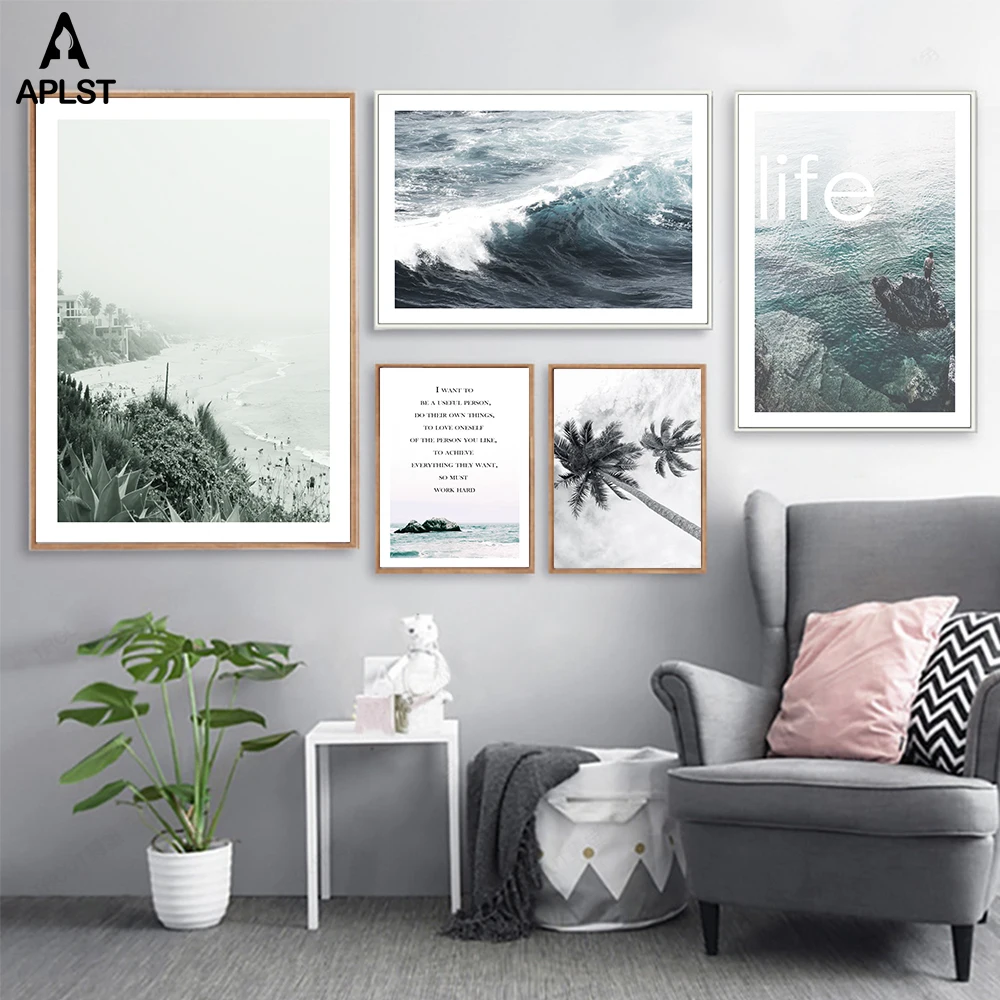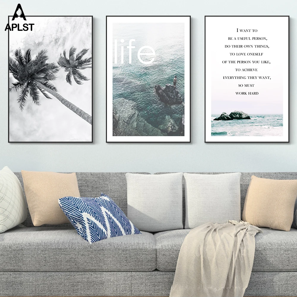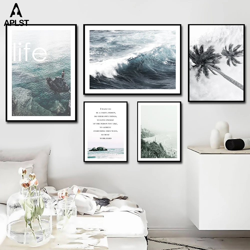 Скандинавский морской пейзаж, холст, настенный художественный постер, пальма, Пляжная Жизнь, цитата, скандинавские принты, картины, декор для гостиной