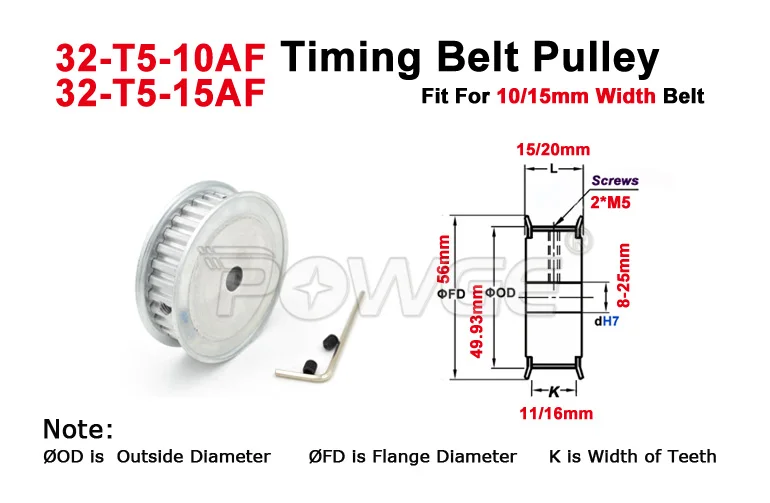 Зубчатый шкив привода ГРМ POWGE, 32 зуба, T5, отверстие 8-25 мм, подходит W = 1015 мм, синхронный ремень T5 32 T 32 зуба, Ремень ГРМ T5, шкив 32-T5