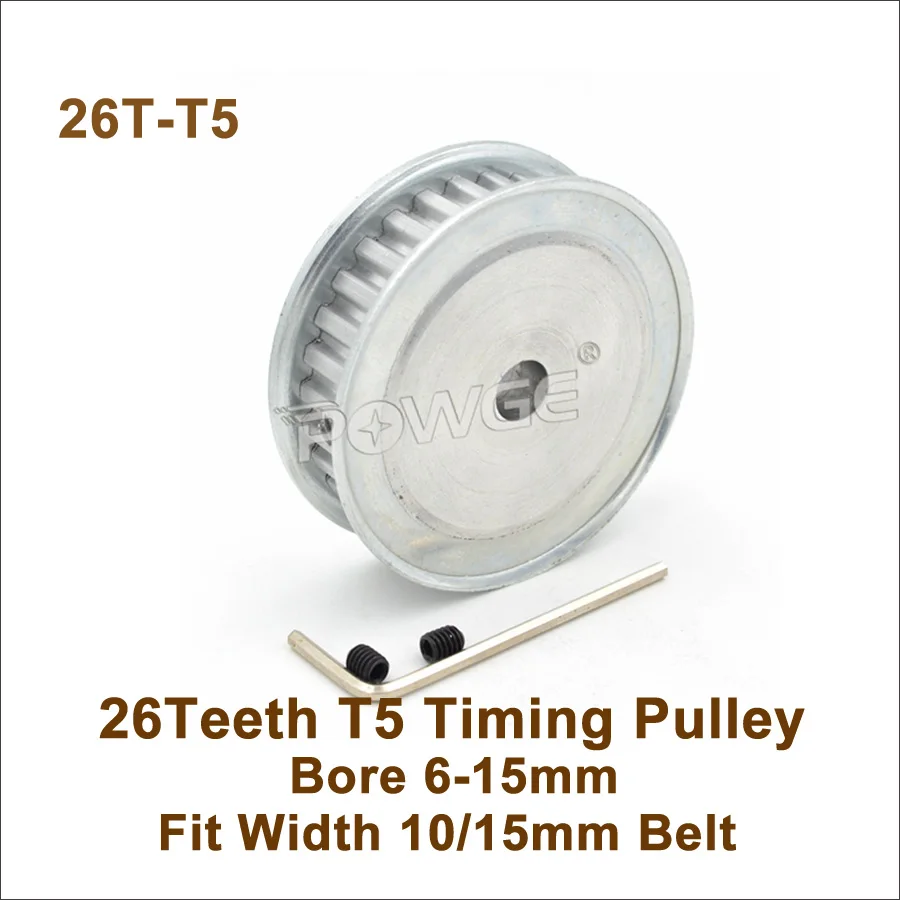 Зубчатый шкив POWGE 26 зубьев T5, отверстие 6-15 мм, подходит W = 1015 мм, синхронный ремень T5 26 T 26 зубьев T5, зубчатый ремень 26-T5