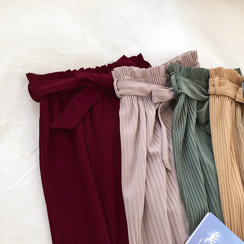 Осенние широкие брюки, женские повседневные брюки с высокой талией и поясом с бантом, новинка 2019, плиссированные брюки, женские брюки