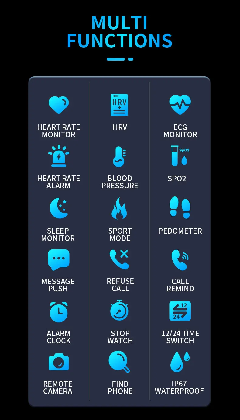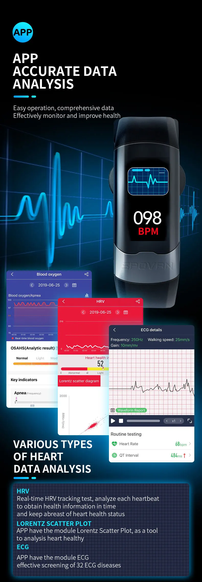 Спецификация: 1. Смарт-браслет ЭКГ с супер большим цветным экраном 1,14 дюйма, результат тестирования ЭКГ является точным почти близким к тестированию медицинской машины. 2. Можно использовать с профессиональным ЭКГ, наклейка на грудь во время сна, автоматическое и непрерывное Точное обнаружение ЭКГ. 3. С точным монитором кислорода в крови, артериальным давлением, функциями пульсометра. 4. Может читать, сохранять и делиться всеми результатами тестирования в приложении, вы можете анализировать данные тестирования о вашем здоровом состоянии. 5. Шагомер точно и автоматически регистрирует количество ваших ежедневных шагов 6. Отображает входящие звонки, сообщения, электронные письма и активность в социальных сетях 7. Мультиспортивный режим позволяет более точно записывать данные при ходьбе, беге, скалолазании и езде на велосипеде 8. Создайте здоровый образ жизни с помощью устанавливаемых будильников, напоминаний о малоподвижности и предупреждений о воде. 9. Полностью совместим с устройствами Android и IOS Название продукта 1,14 "сенсорный экран Фитнес Смарт-браслет бренд с ЭКГ ppg hrv Материал ремешка ТПУ Размер x 22 мм Вес 26 г Разрешение 240x135 Размер экрана TFT1.14inch Поддержка сенсорного управления Емкость аккумулятора 150 мАч Адаптер питания USB зажим (3 точки) Водонепроницаемый IP67 ЦП NRF52832 + Silabs1182 Поддержка системы Android, iOS SRAM 176kb Флэш-память 512 Кб Функция: время, неделя, дата, шагомер, калории, цели, данные, напоминание о звонках, напоминание о приложении, расстояние, Bluetooth, водонепроницаемость IP67, дистанционное управление камерой, ЭКГ, монитор артериального давления