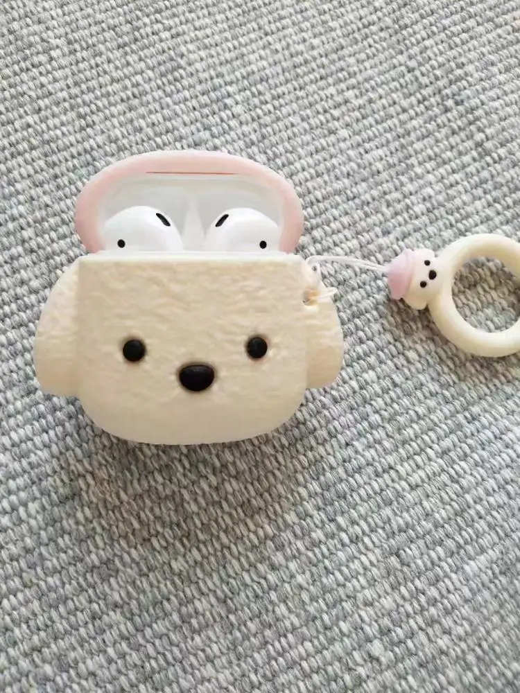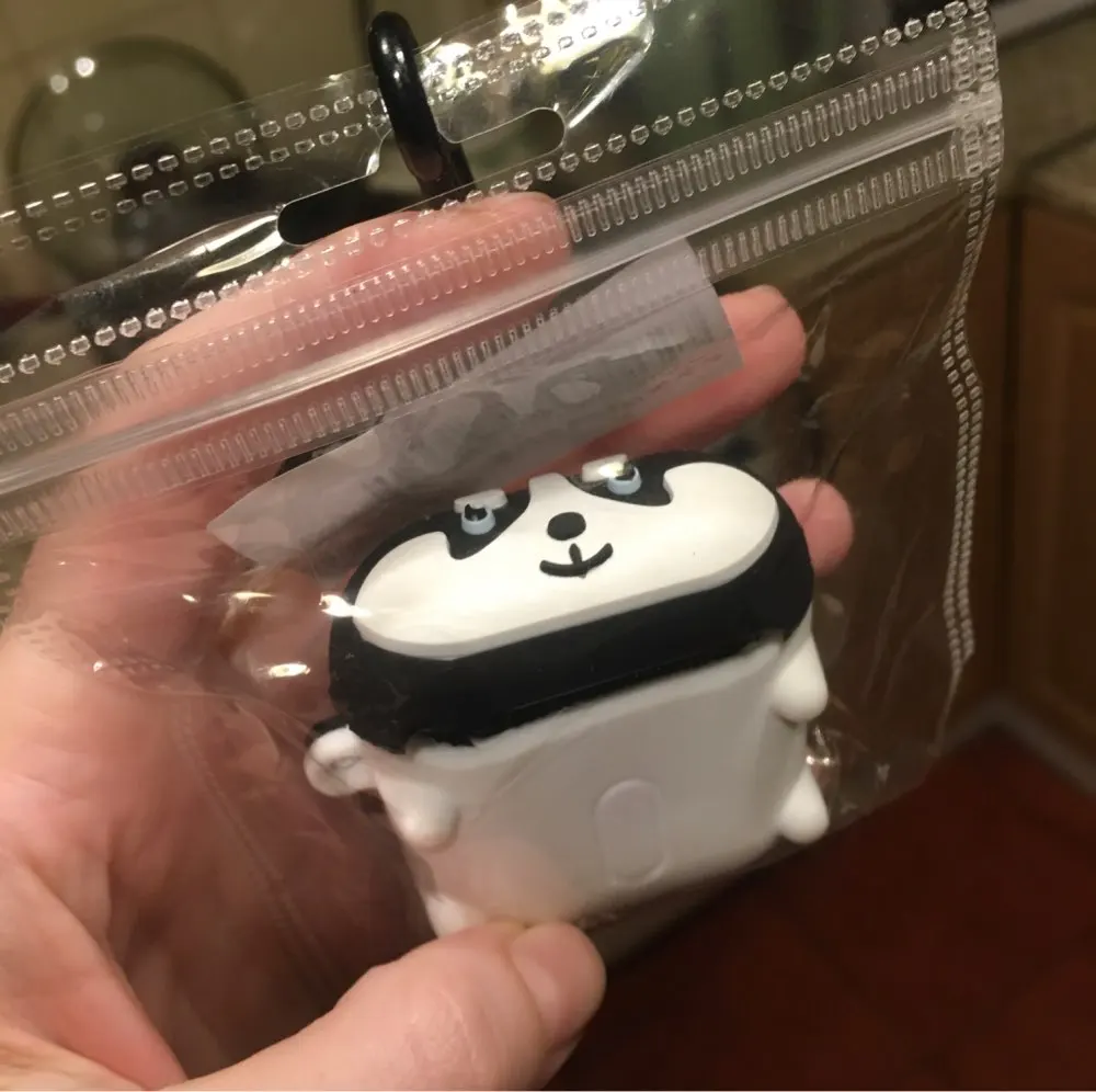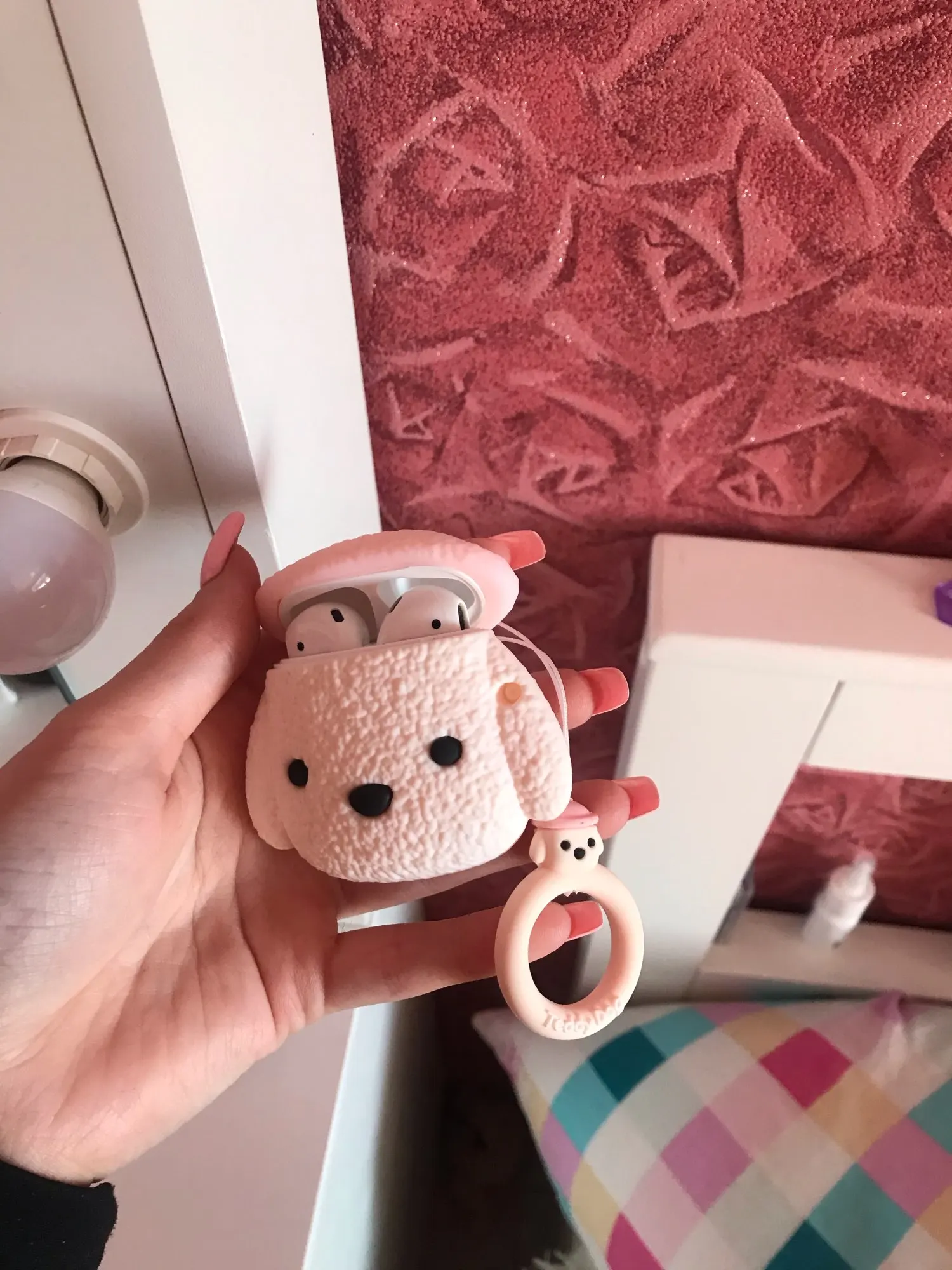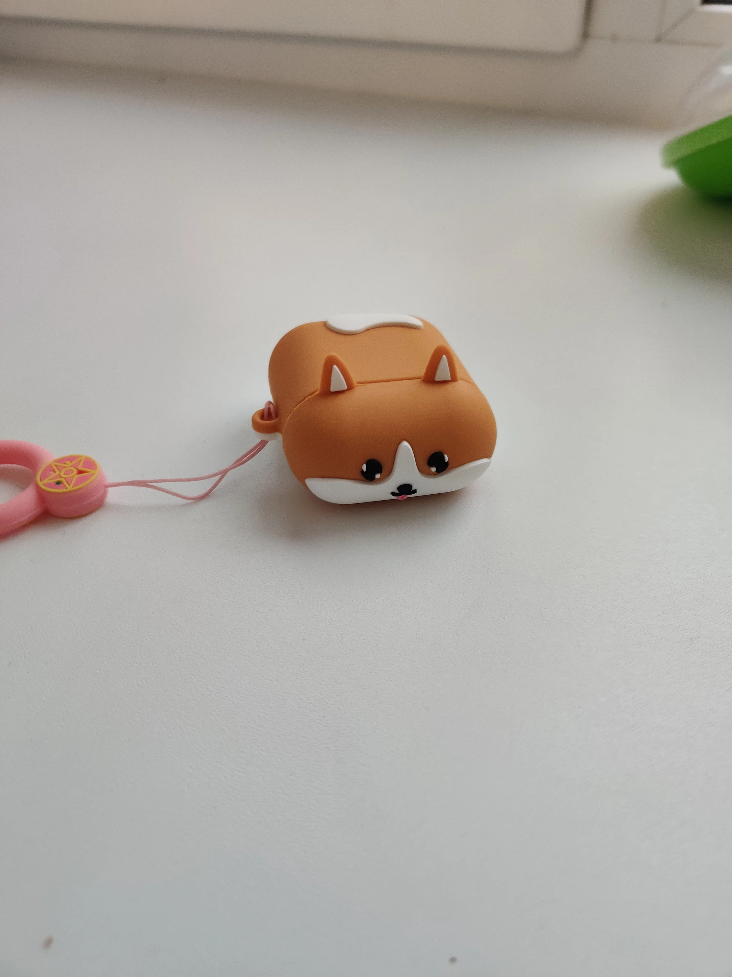 Прекрасный чехол для наушников с пёселем Пришёл довольно быстро (2-3 недели) до Томска. Материал из которого выполнен чехол является чем-то между силиконом и пластмассой. Чехол сильно не пачкается и не спадает (при этом проблем со снятием чехла не возникает). Проблем с закрытием и открытием кейса для наушников у меня также не возникло. Сам чехол довольно милый. Да имеются небольшие излишки материала, но это можно легко убрать.