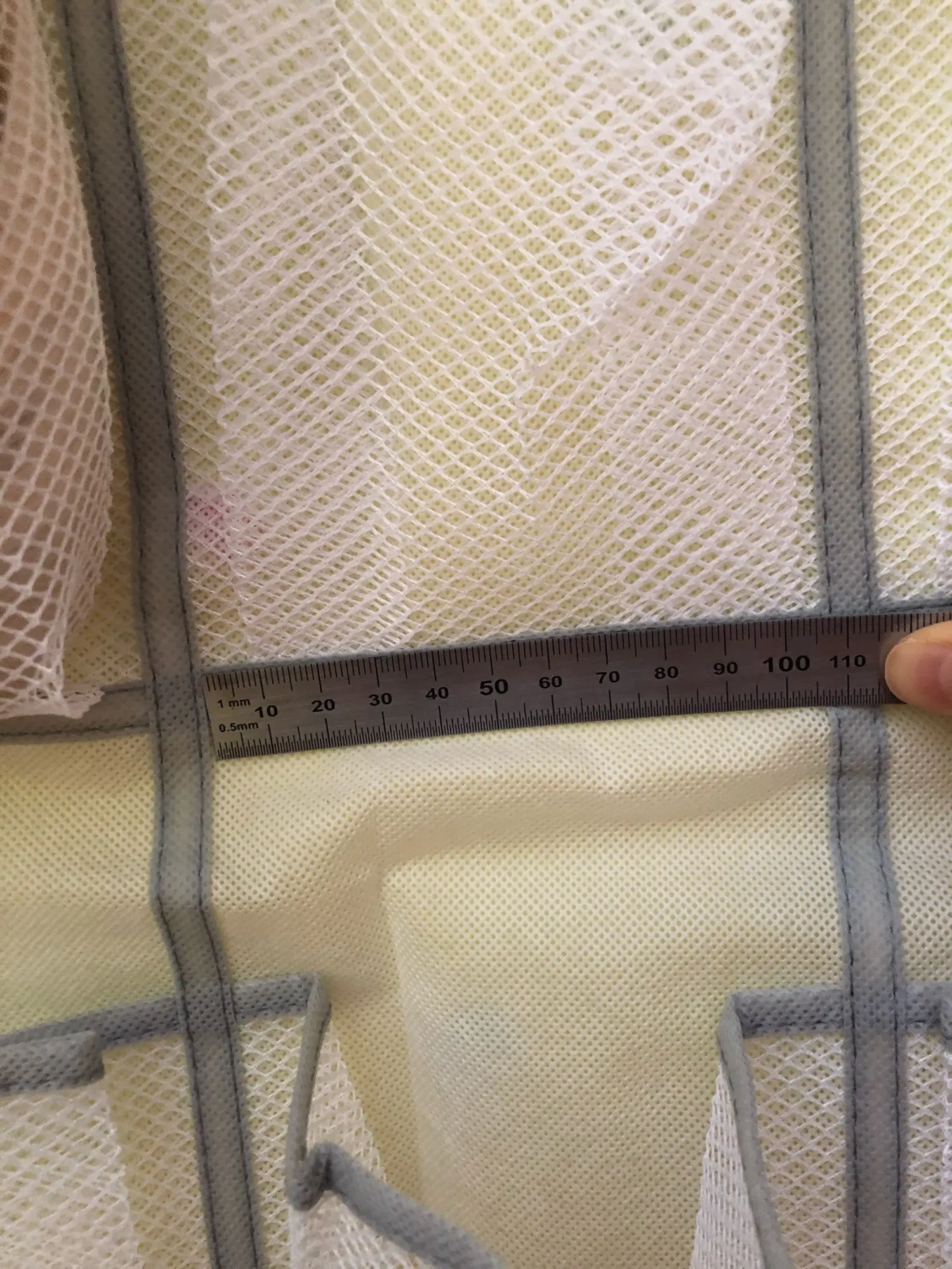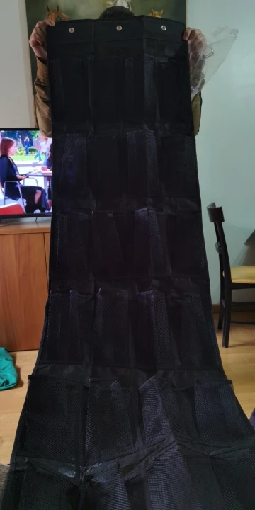 Товар точно такой же, как и в рекламе. С тремя крючками, чтобы повесить на дверь. Карманы отличные и вмещают обувь выше. Хорошее качество и хорошее качество изготовления.