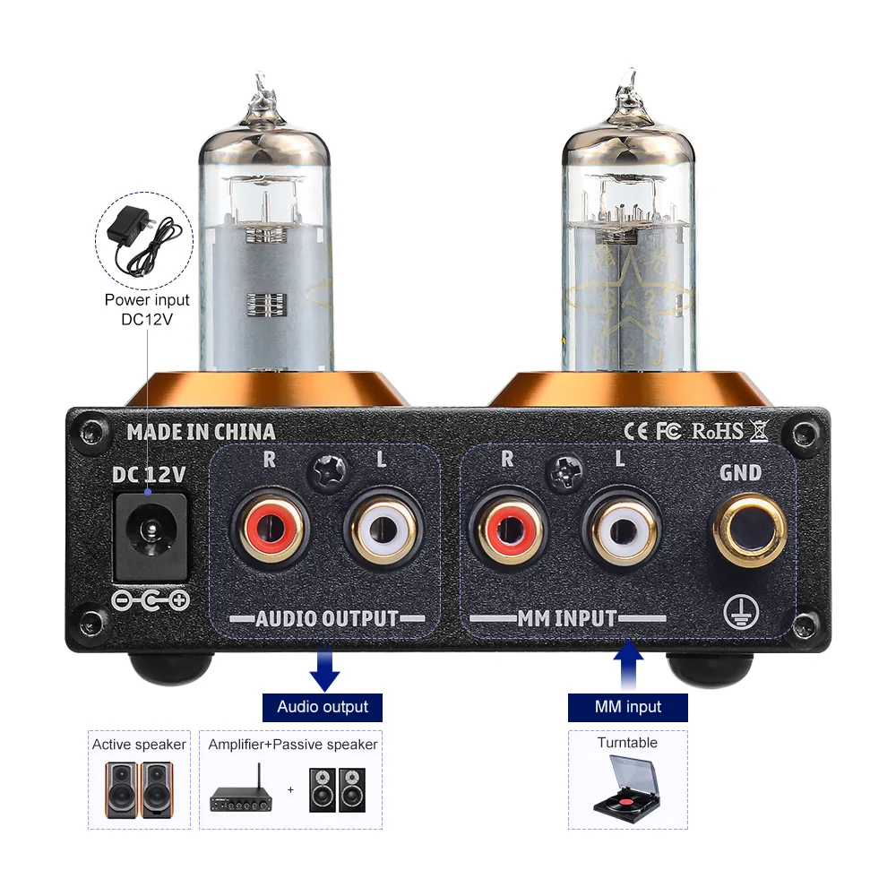 1. Переключатель передач находится в выключенном состоянии.2. Вставьте поставляемую трубку в держатель трубки в направлении (трубка не имеет значения, проверьте, деформируется ли нижний штырь перед установкой трубки, и деформация может быть изменена вручную).3. Подключите выход-выход кабеля к аудио входному разъему.4. Подключите заднее устройство, которое нуждается в внешнем подключении к разъему аудиовыхода.5. Подключите источник питания DC12V.6. Поверните переключатель передач, чтобы выбрать желаемую шестерню усиления.7. Когда вход преампа является входным, фоновходной сигнал автоматически переключается на входной сигнал преампа.8. Входной интерфейс: (может быть подключен к CD, декодеру DAC, мобильный телефон, телевизор и т. д.)9. Интерфейс аудиовыхода: (например, усилитель, усилитель, активный динамик и т. д., красный на правый канал, белый левый канал)