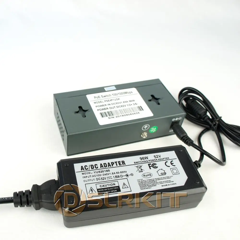 DSLRKIT PSE4P1UGK PoE коммутатор x1 (с розничной коробкой)Адаптер питания переменного тока (выход постоянного тока: 52 в/1.85A) x1Кабель питания переменного тока x1Штепсельная вилка переменного тока-это тип США, ЕС или Австралии, если вам нужен другой тип (Великобритания), пожалуйста, оставьте сообщение.
