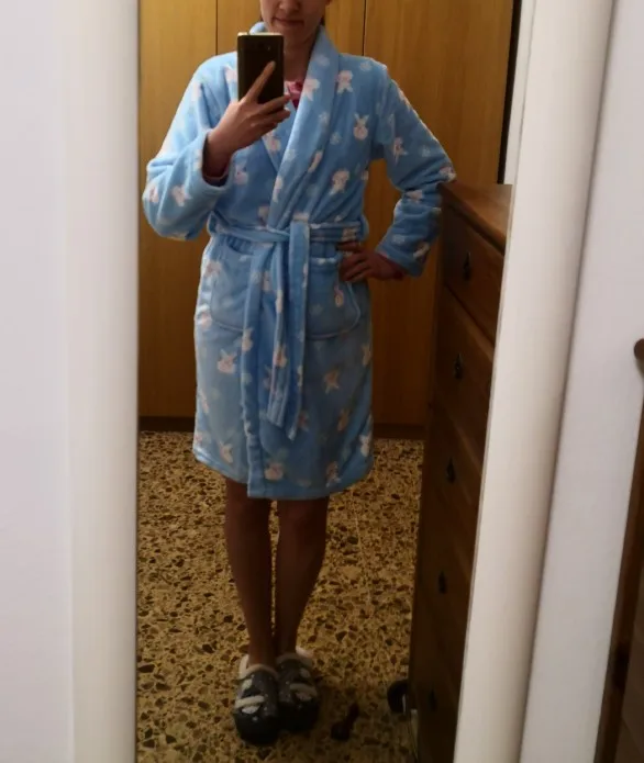 Халат красивый и мягкий. Надеюсь, что и тёплый. Заказывала маме, размер, кажется, маловат, хоть и заказывала самый большой. Отдам маме и проверю. В любом случае, товар хороший и продавец отзывчивый и отвечает на все вопросы. Рекомендую